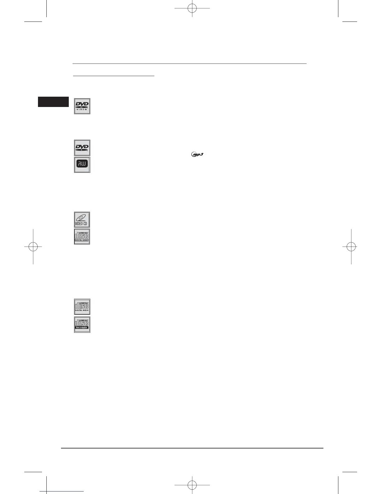 In order to ensure playback, discs must conform with DVD, CD, VCD or SVCD standards. This