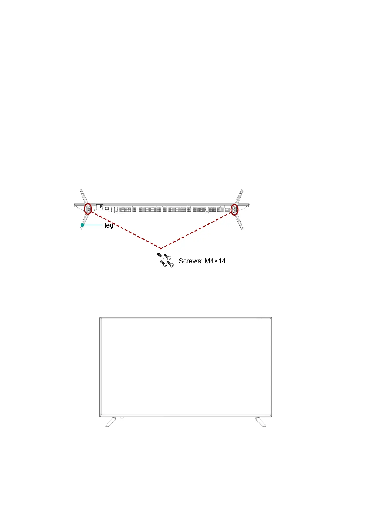2. Place the legs into the bottom slots of the TV, insert and tighten the screws (found in the