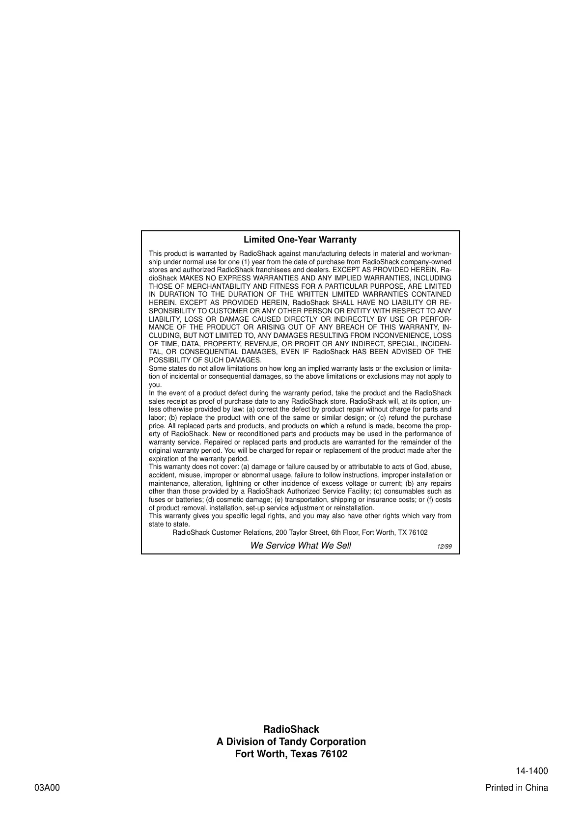 This product is warranted by RadioShack against manufacturing defects in material and workman-