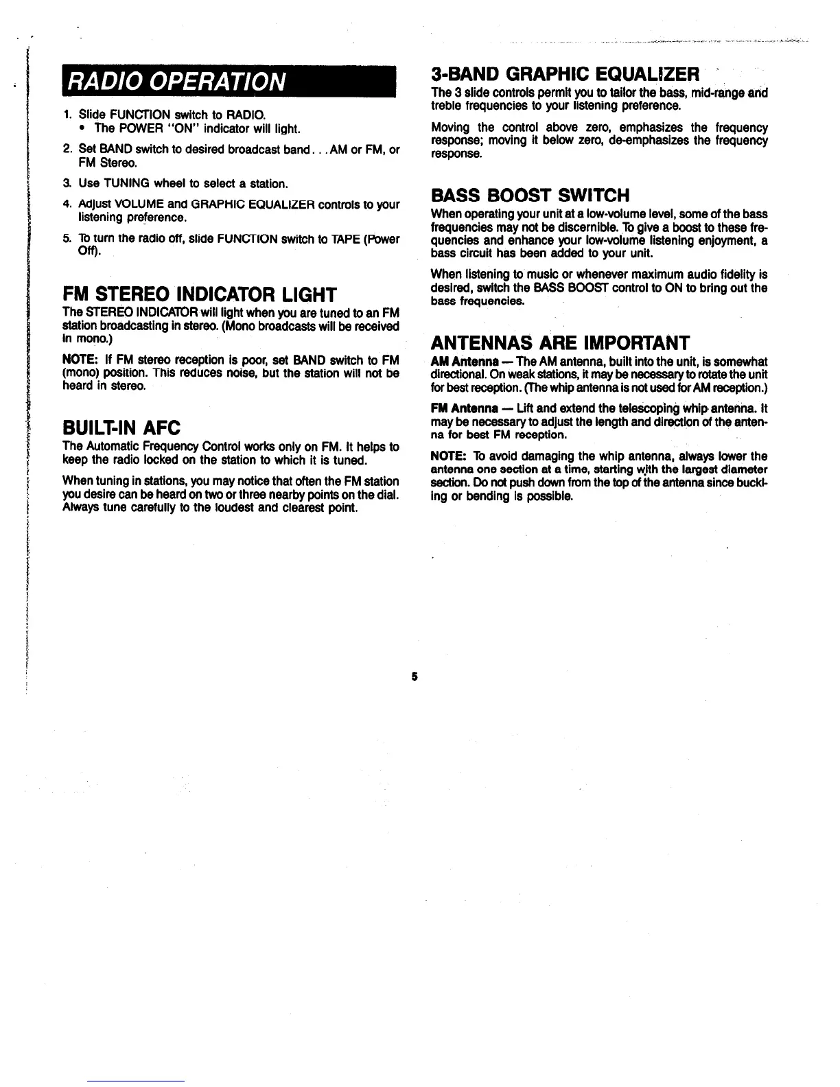 5. To turn the radio off, slide FUNCTION switch to TAPE (Power