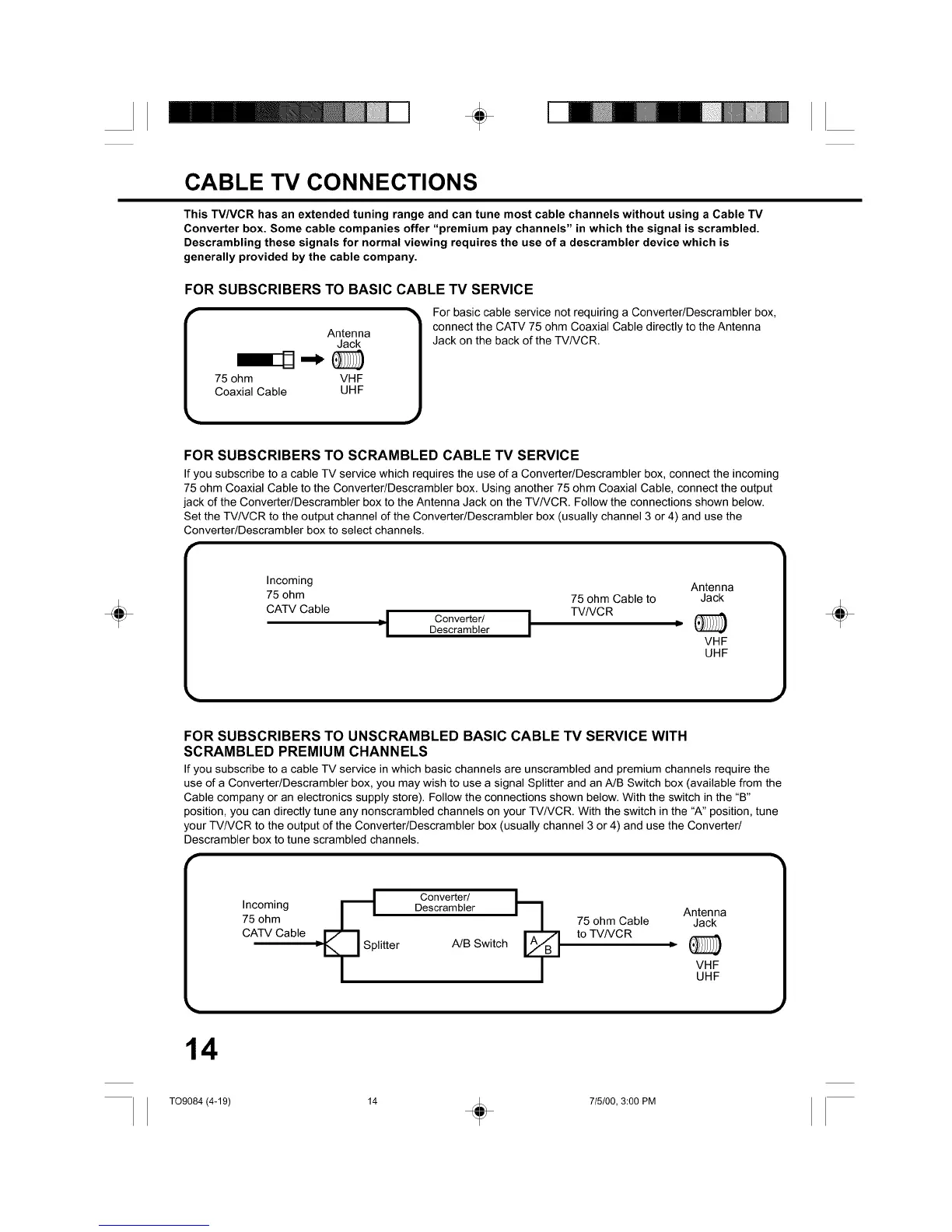 use of a Converter/Descrambler box, you may wish to use a signal Splitter and an A/B Switch box (available from the
