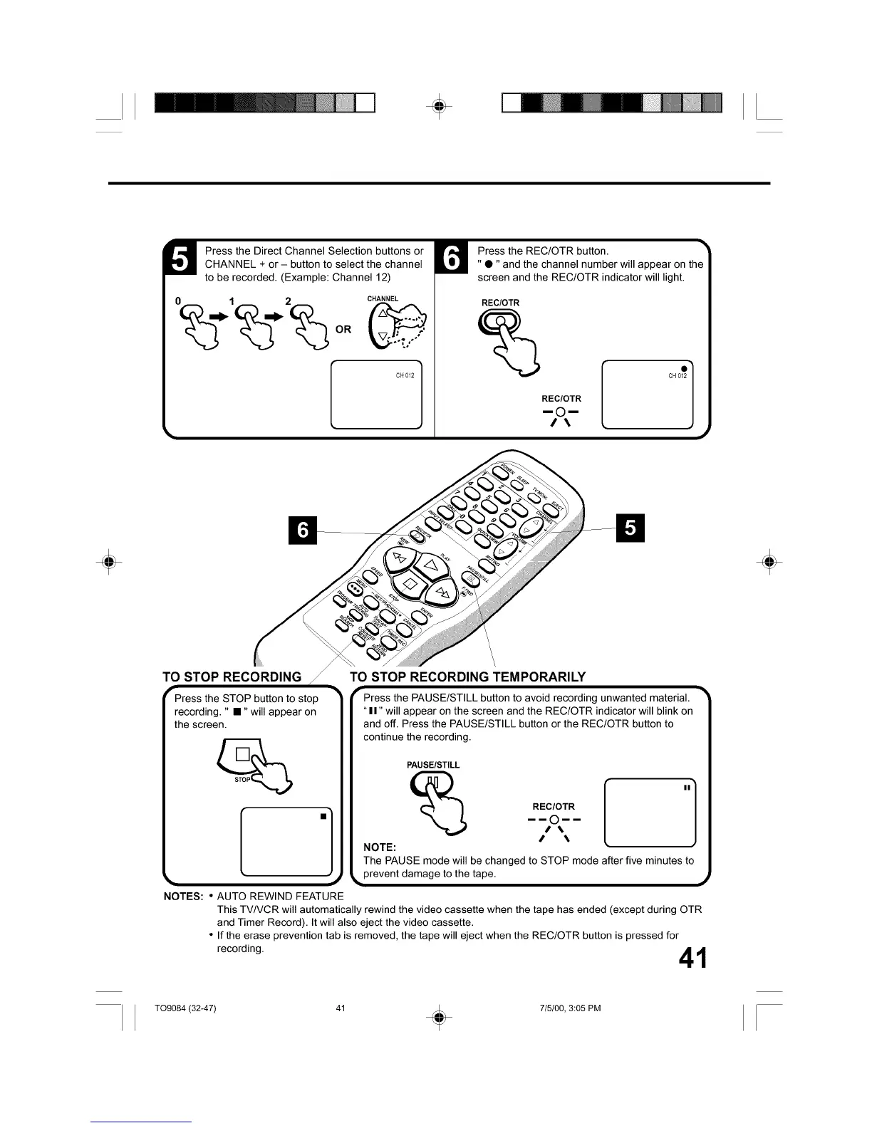 This TV/VCR will automatically rewind the video cassette when the tape has ended (except during OTR