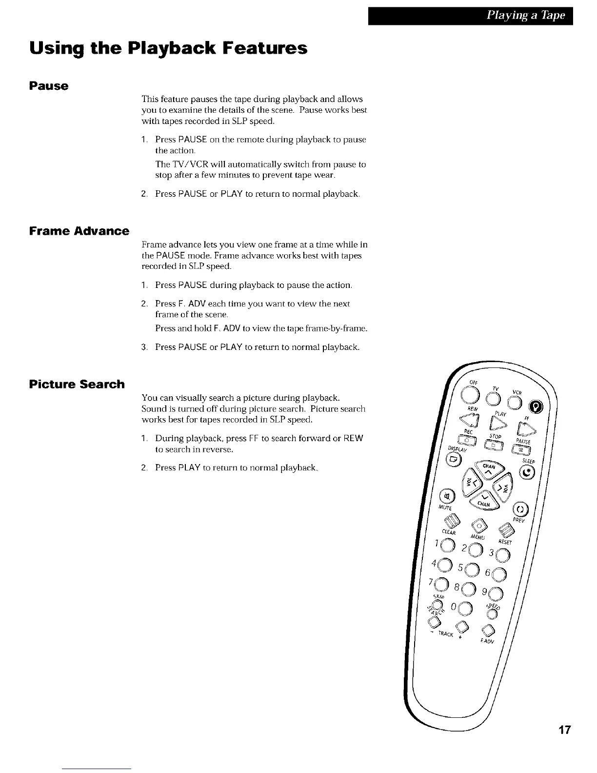 the PAUSE mode. Frame advance works best with tapes