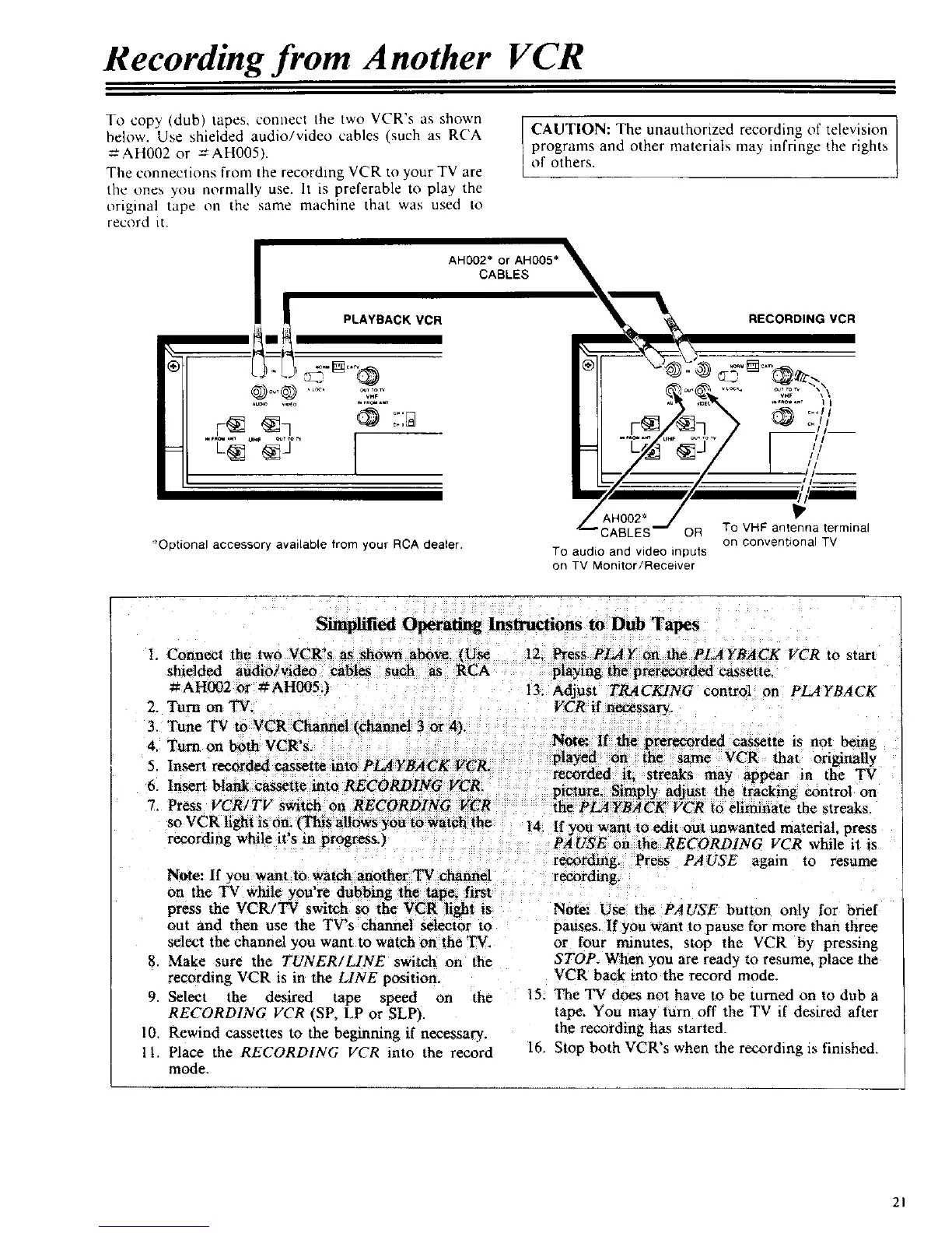 To copy (dub) tapes, connect the two VCR's as shown