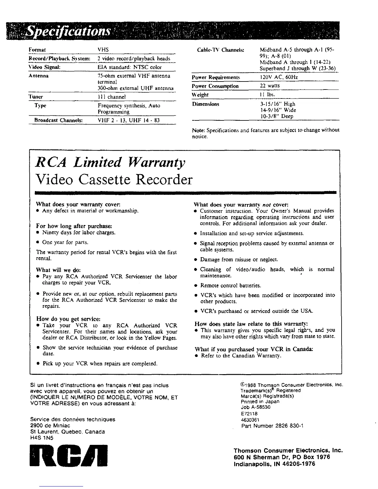 • Take your VCR to any RCA Authorized VCR