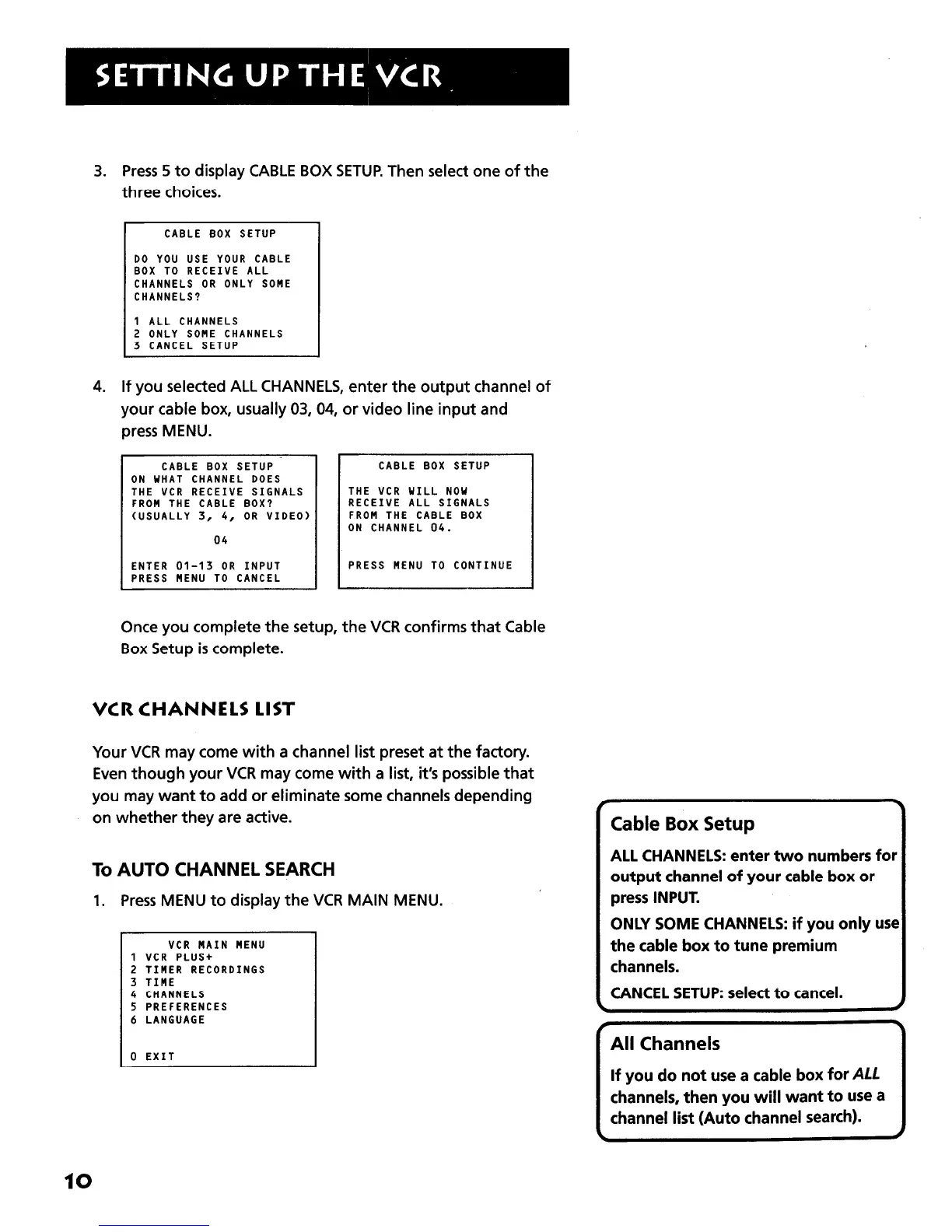 3. Press 5 to display CABLE BOX SETUP Then select one of the