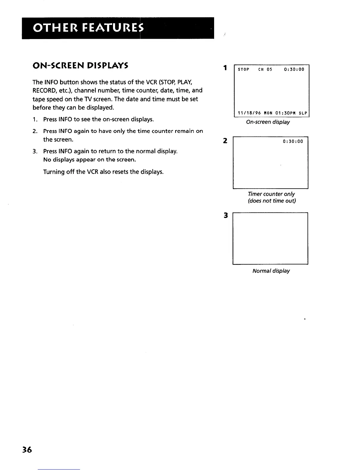 The INFO button shows the status of the VCR (STOP, PLAY,