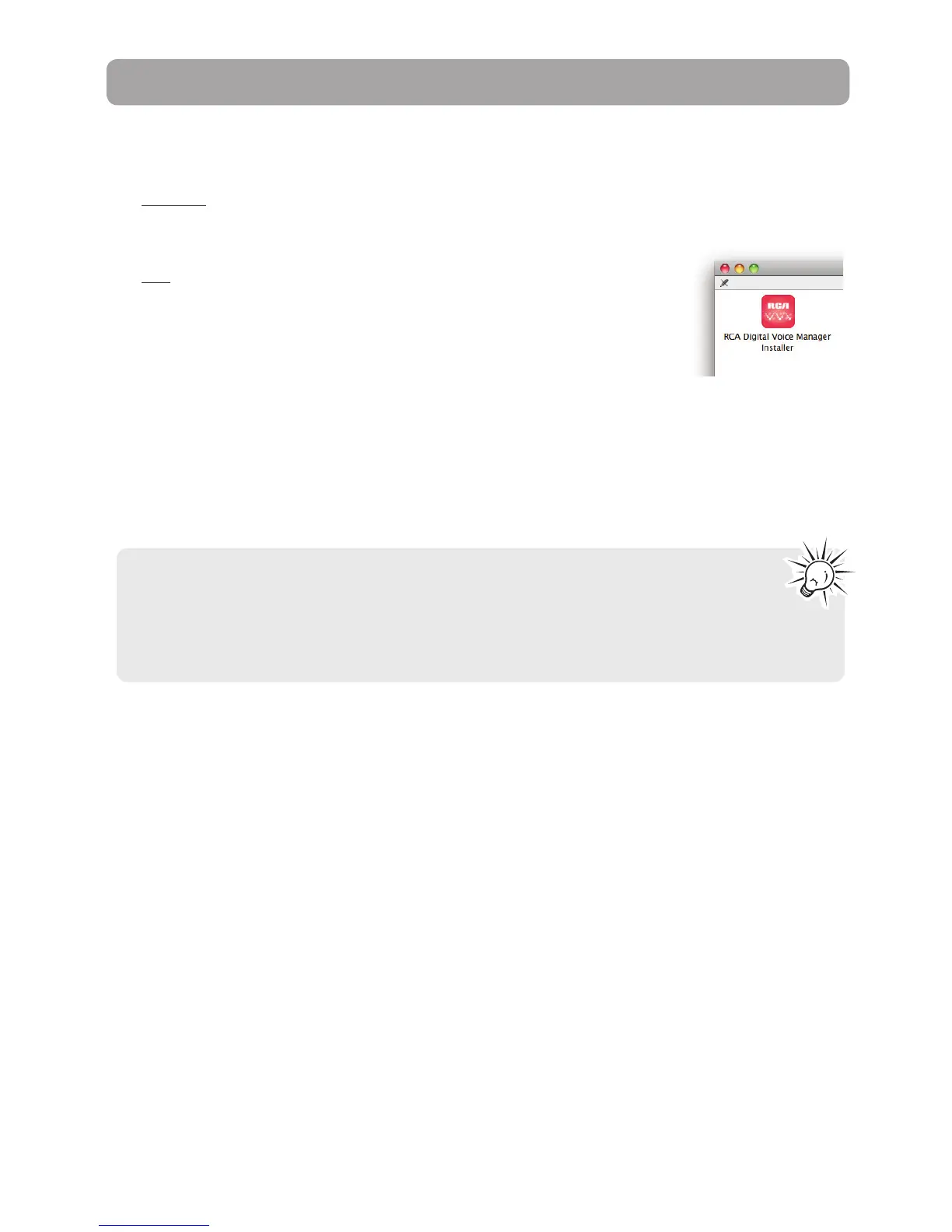 Mac: To access the RCA Digital Voice Manager installer, the player will mount as a