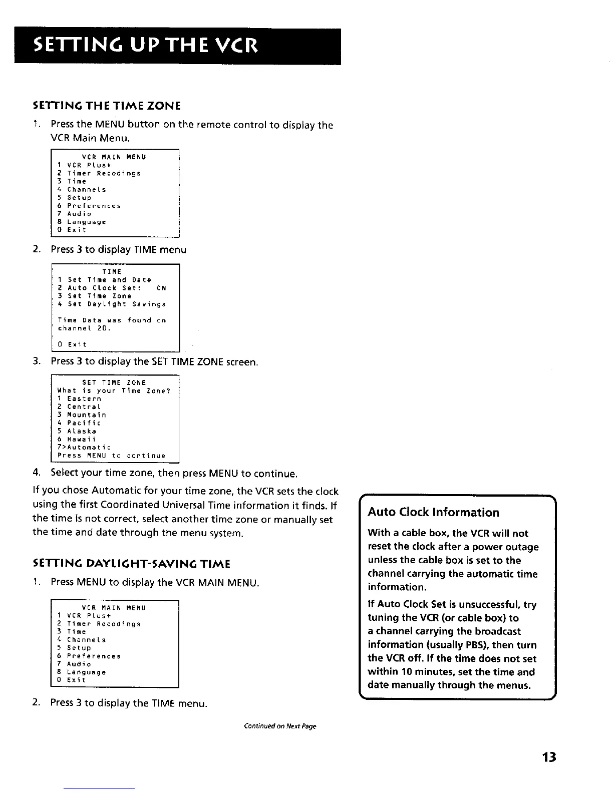 If you chose Automatic for your time zone, the VCR sets the clock