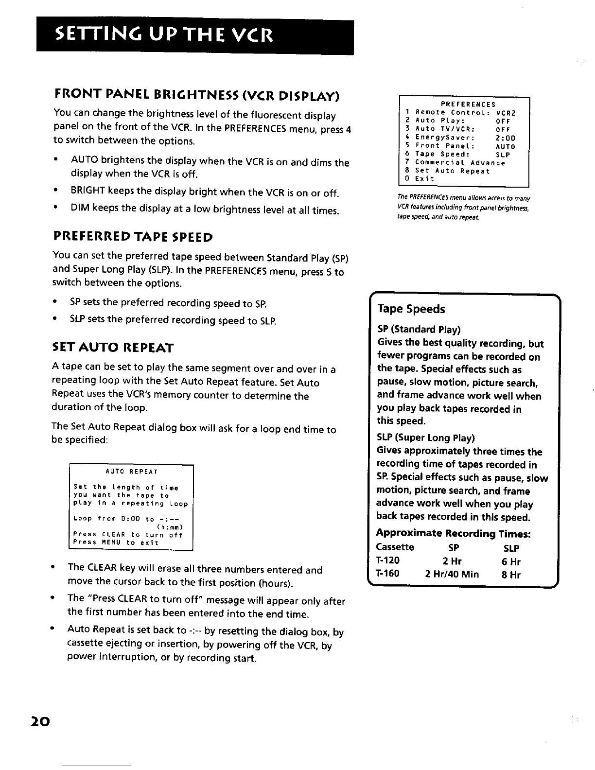 and Super Long Play (SLP). In the PREFERENCESmenu, press 5 to