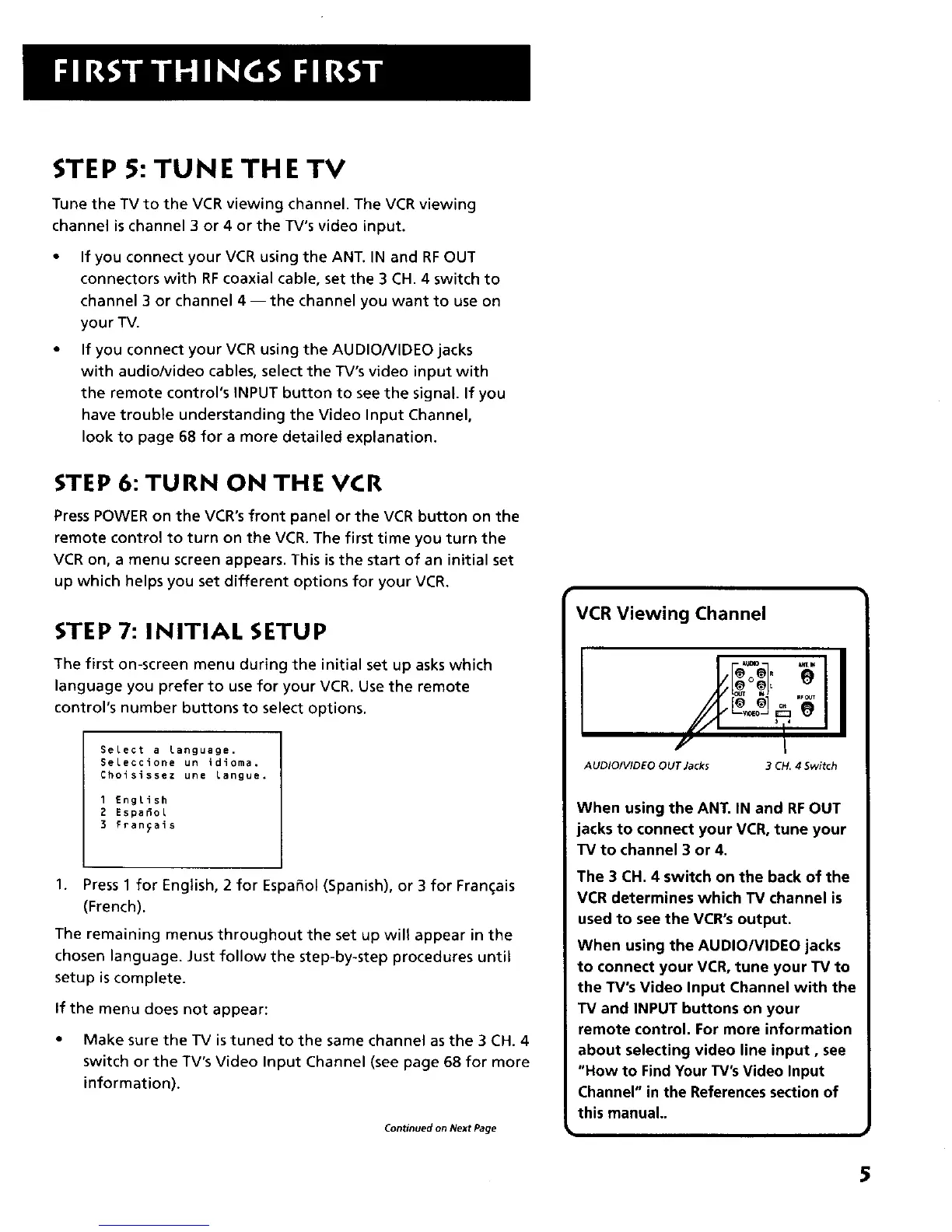 VCR on, a menu screen appears. This is the start of an initial set