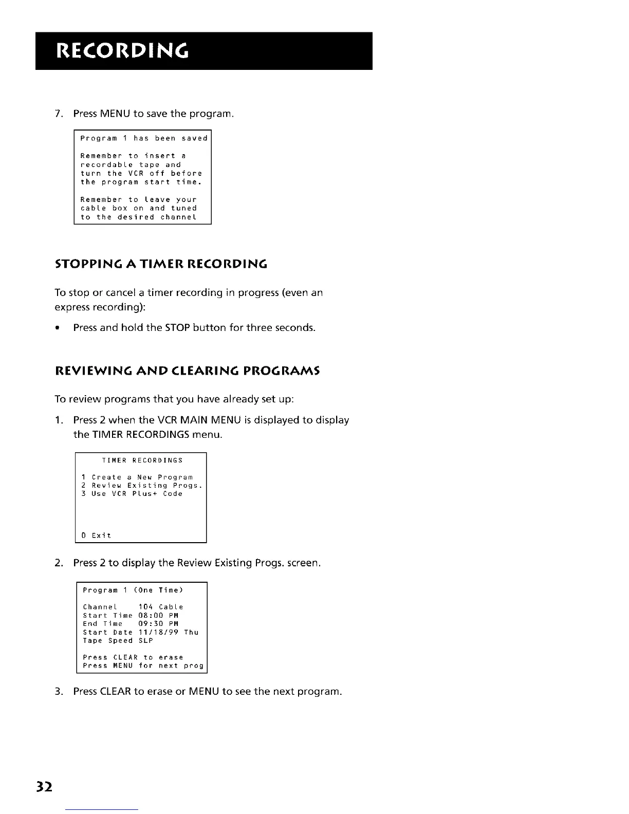1. Press 2 when the VCR MAIN MENU is displayed to display