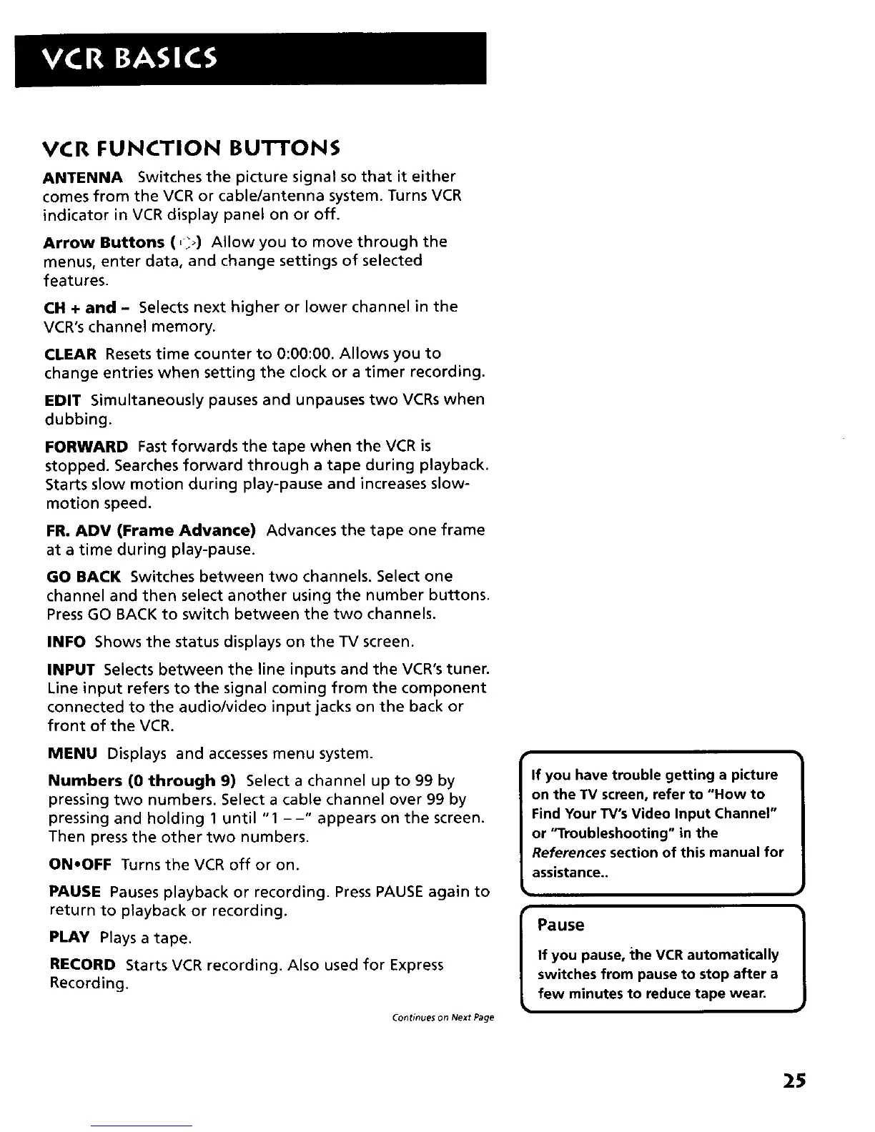 PAUSE Pauses playback or recording. Press PAUSE again to