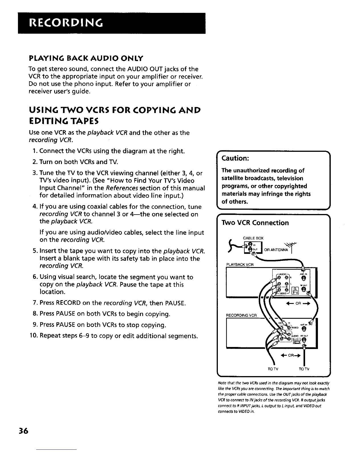 VCRto connect to INjacksof the recording VCR.Routput jacks