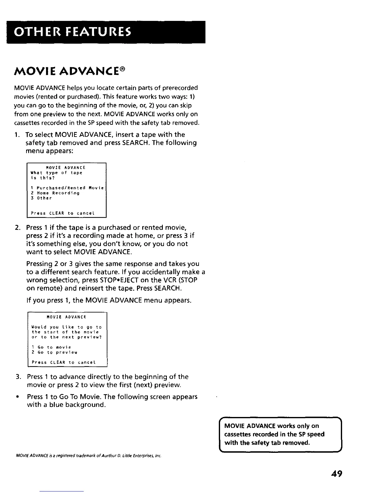 MOVIE ADVANCE helps you locate certain parts of prerecorded