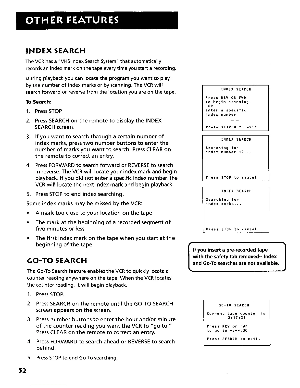 The Go-To Search feature enables the VCR to quickly locate a