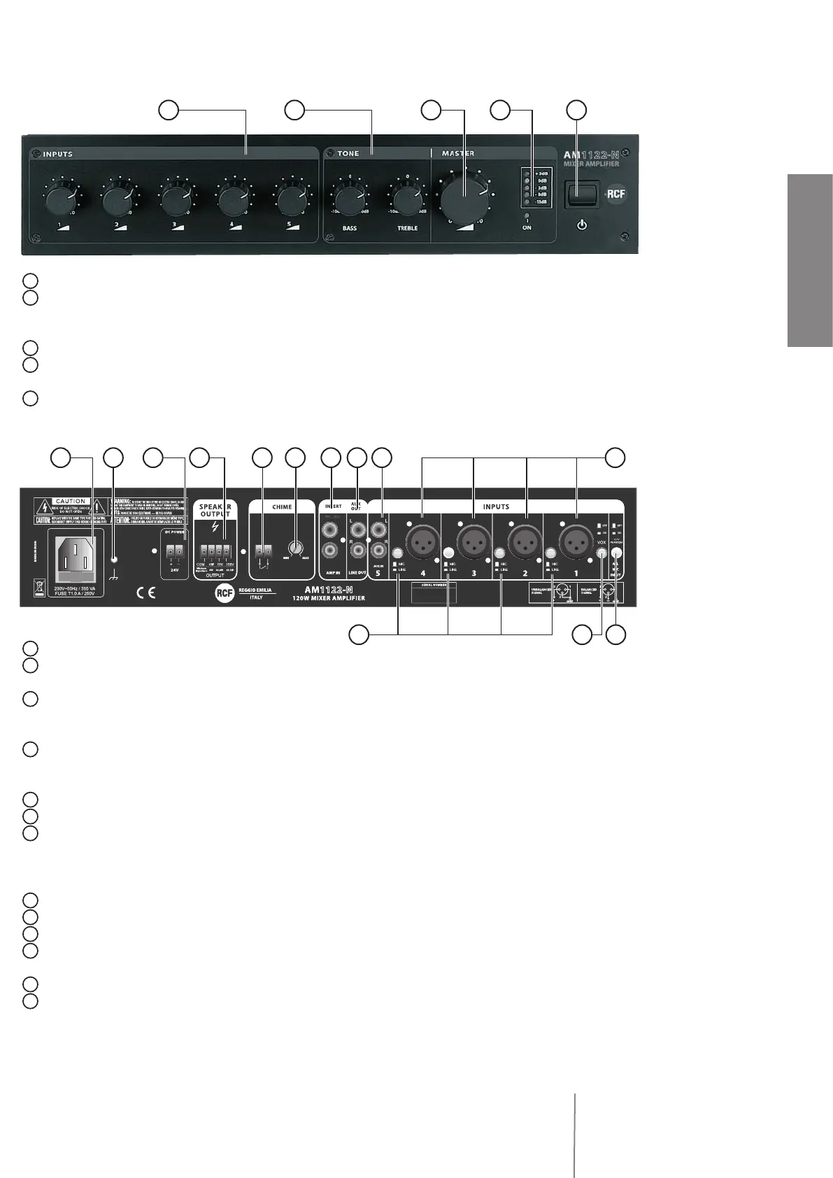 Display of output level (5 LEDs) and power (ON LED). Amplifi er delivers the nominal power