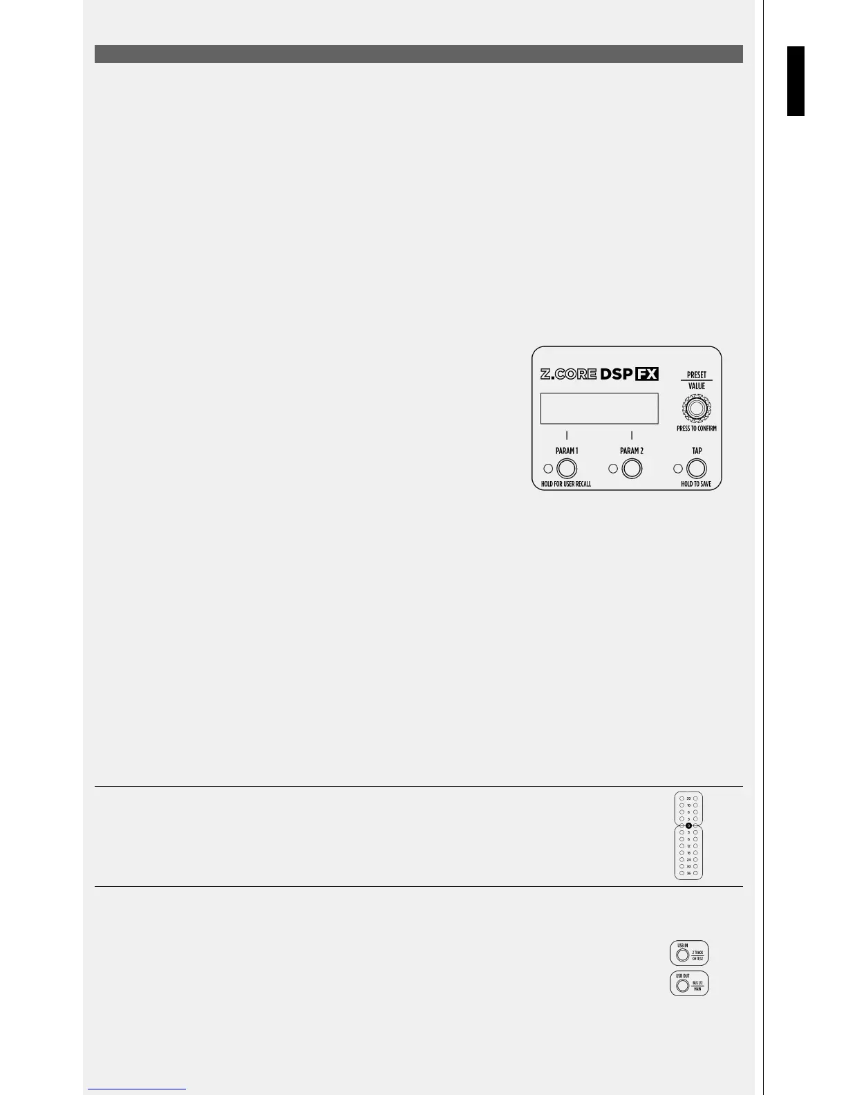 To navigate the Z.CORE DSP FX unit a two-line display is present: the upper line shows the Preset Name, while the lower line indicates the Preset