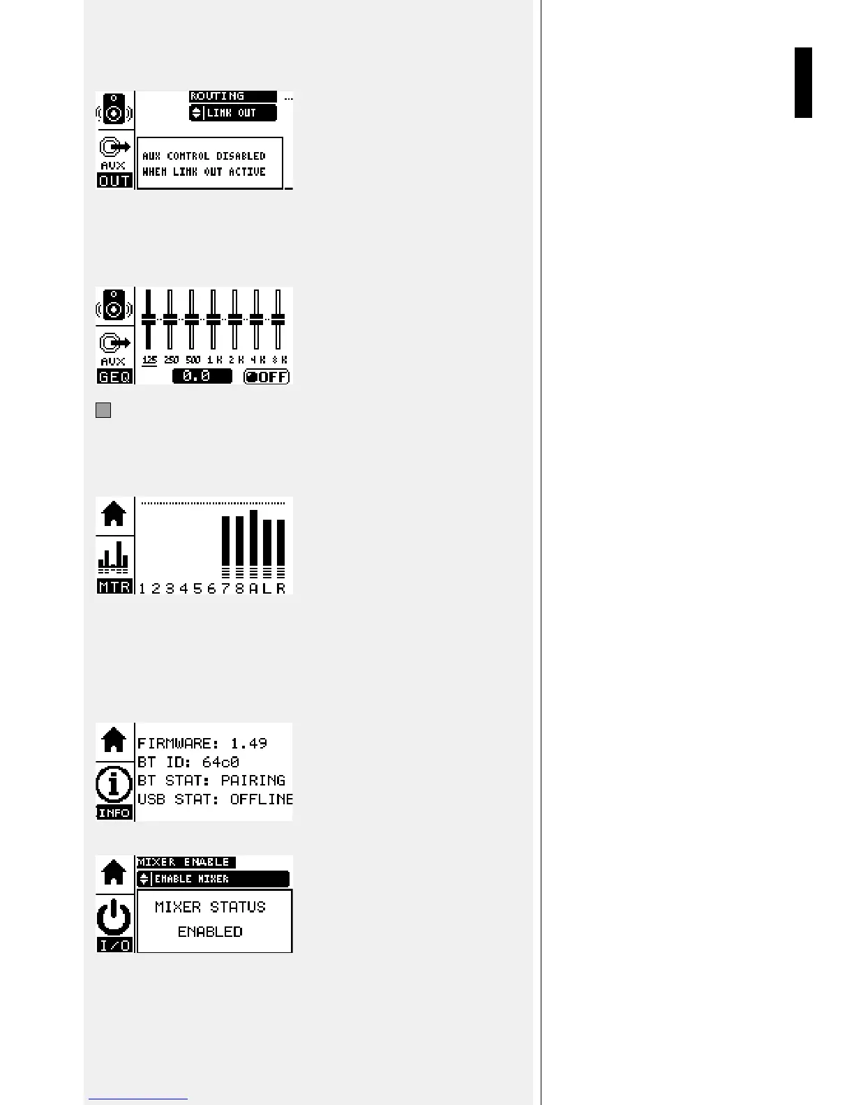 Pressing the HOME button again gives access to the “I/0” MIXER ENABLE DISABLE page.
