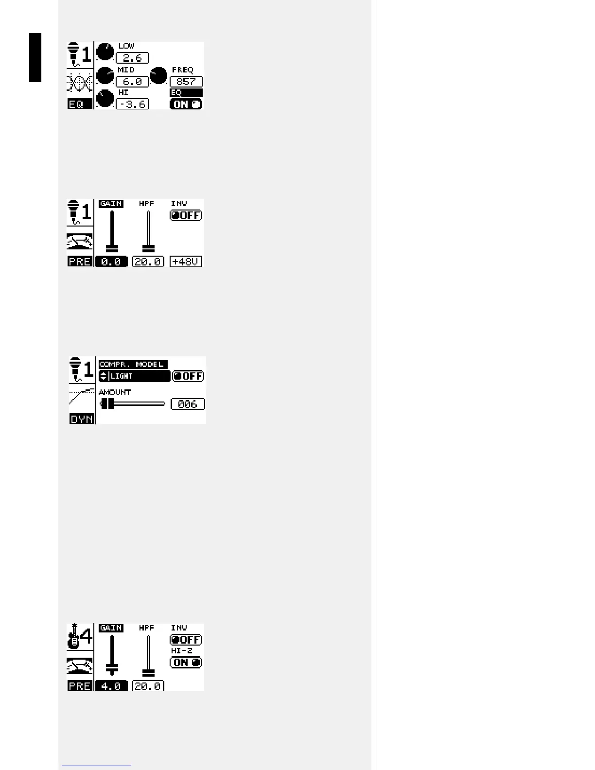 EQUALIZATION (EQ): questa pagina di menu dà accesso ai parametri EQ; ogni canale