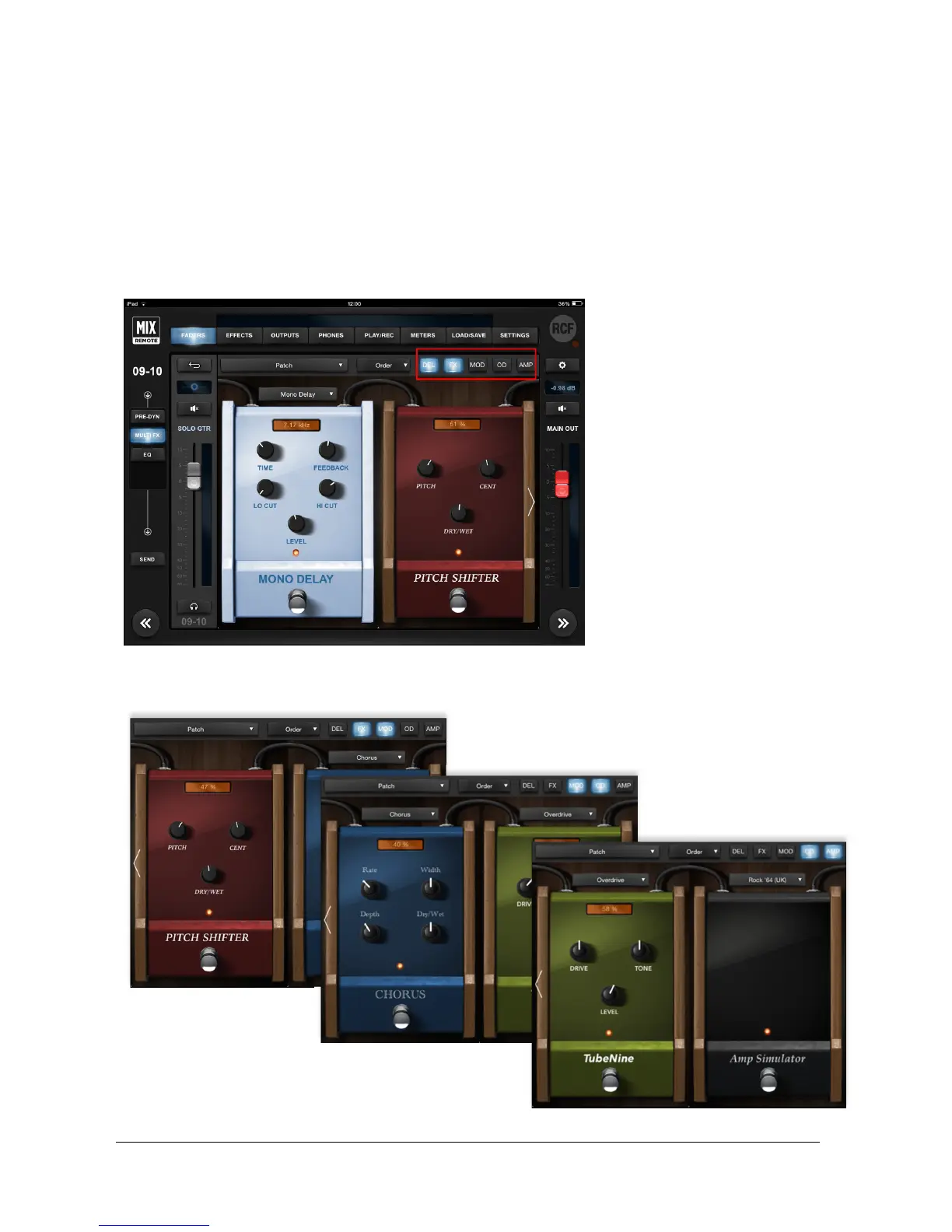 Let’s see an example of the following effects order: DEL, FX, MOD, OD, AMP. The picture above shows the first two