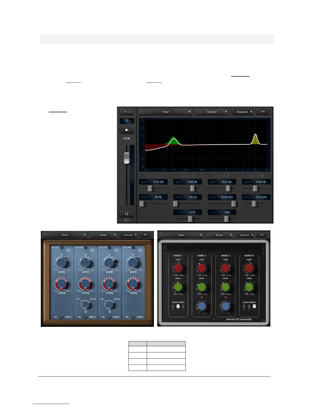 precise EQ), Vintage (modeled after a UK classic EQ), Smooth (whose modeling was inspired by a modern US EQ). You