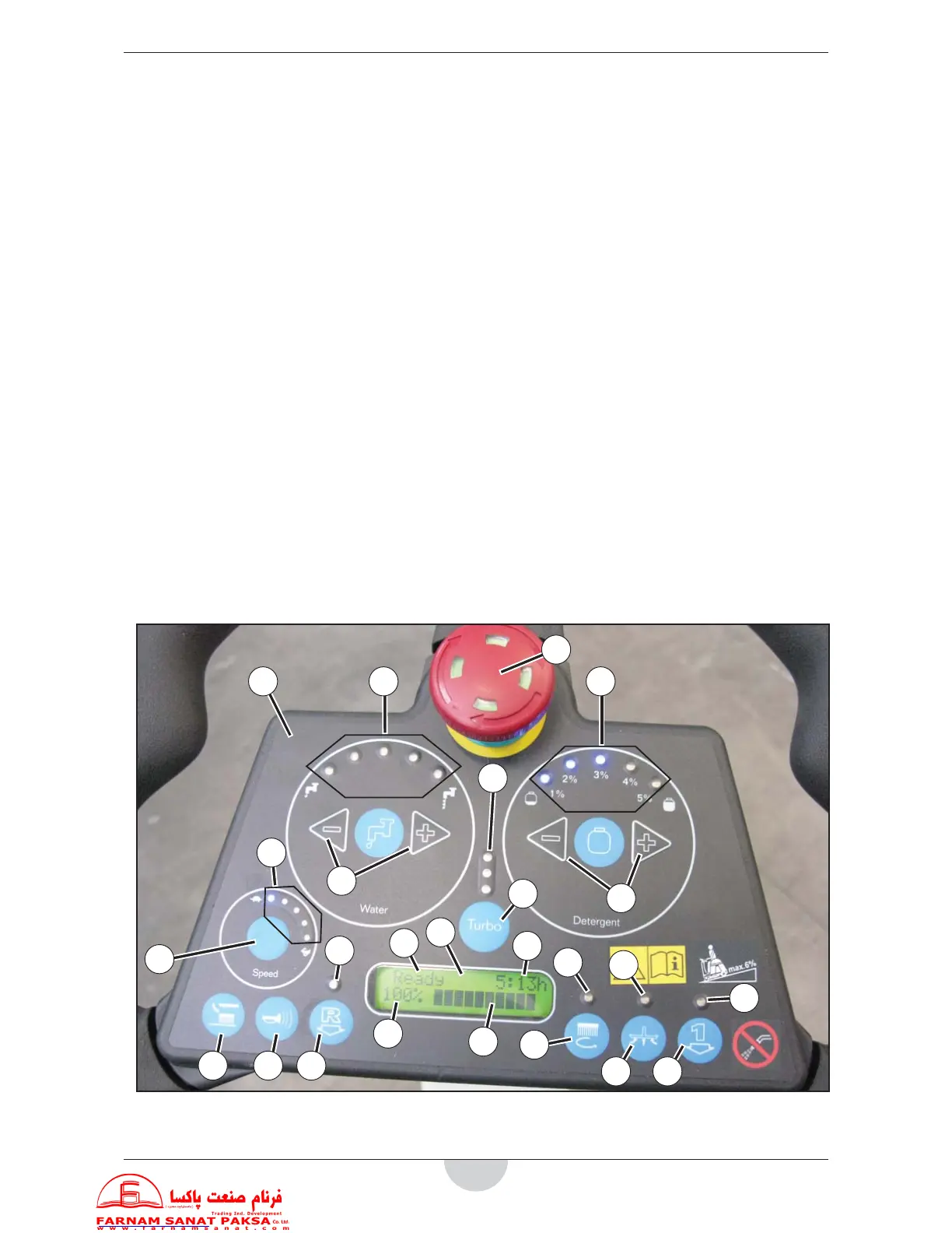 17. Luminous indication of the squeegee, suction and disc brush activated; the luminous indicator ashes during