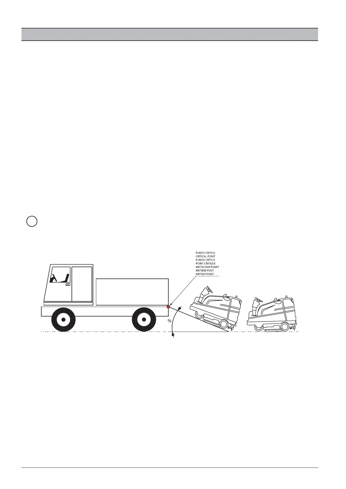 In caso di caricamento della macchina su mezzo di trasporto mediante l’utilizzo di rampe, prestare attenzione alla PENDENZA e al punto CRITICO come