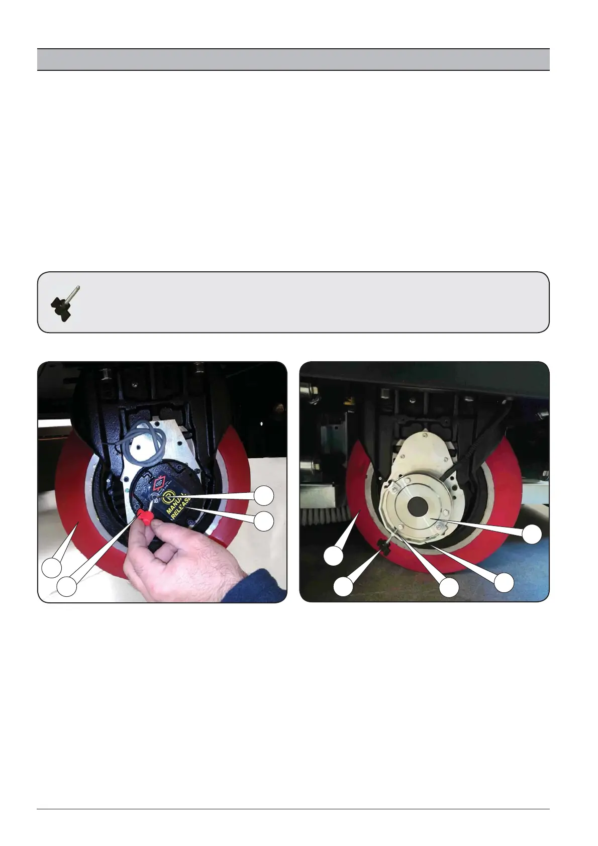 • Terminata questa operazione, svitare e rimuovere la vite a galletto 3 per riattivare nuovamente l’ elettrofreno e riportare la macchina in condizioni di sicurezza.