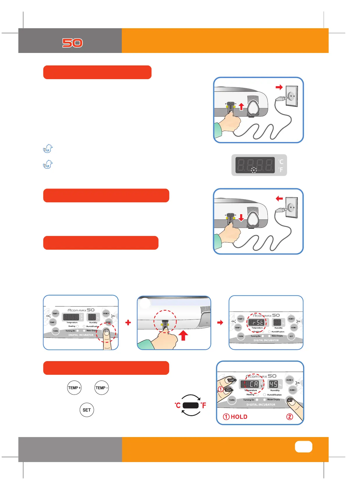power supply as shown on picture. Then, rSt will show on the display, and the incubator will be initialized to