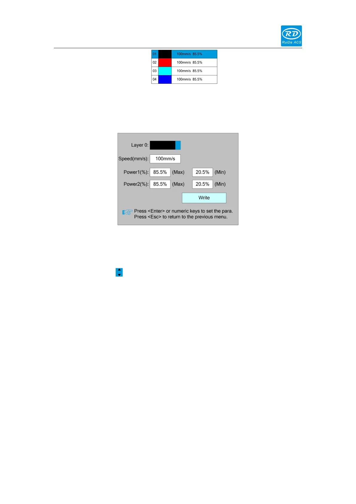 move the "selection block" to the layer parameter entry to be modified. Press the