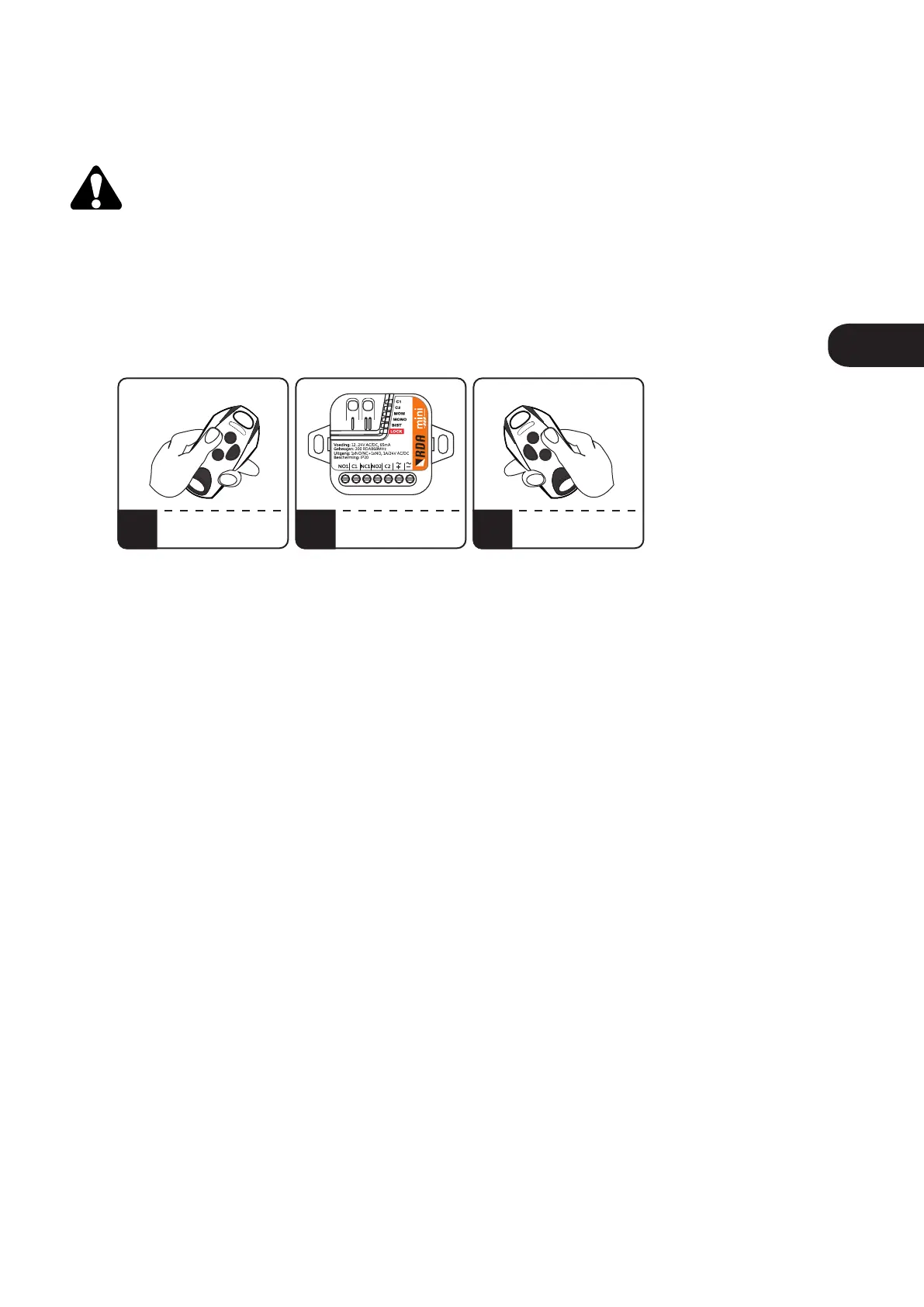 eerst gedurende 15 seconden op een knop van een reeds aangeleerde zender, druk binnen 3 seconden