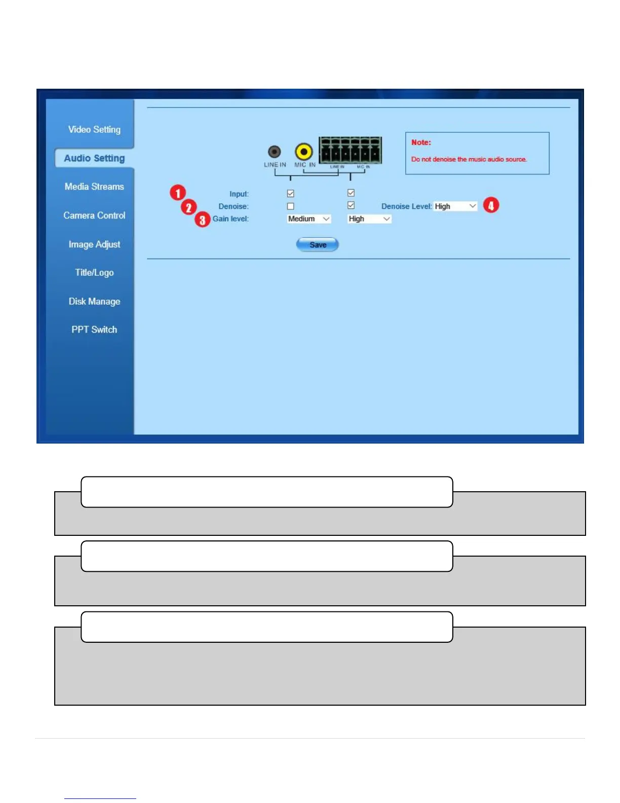 •Check each box to apply a denoise filter for the appropriate input. In most cases, filtering will not be