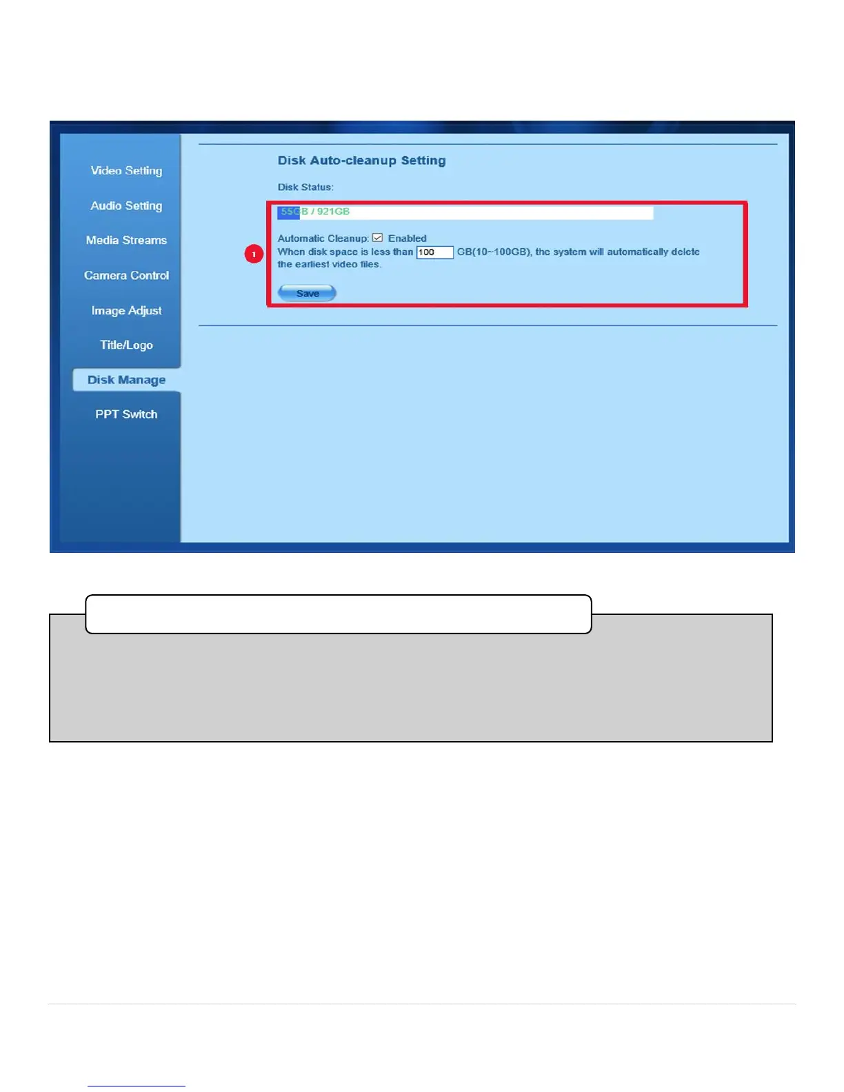 specifying a minimum remianing disk space parameter (selectable range is 10-100GB).