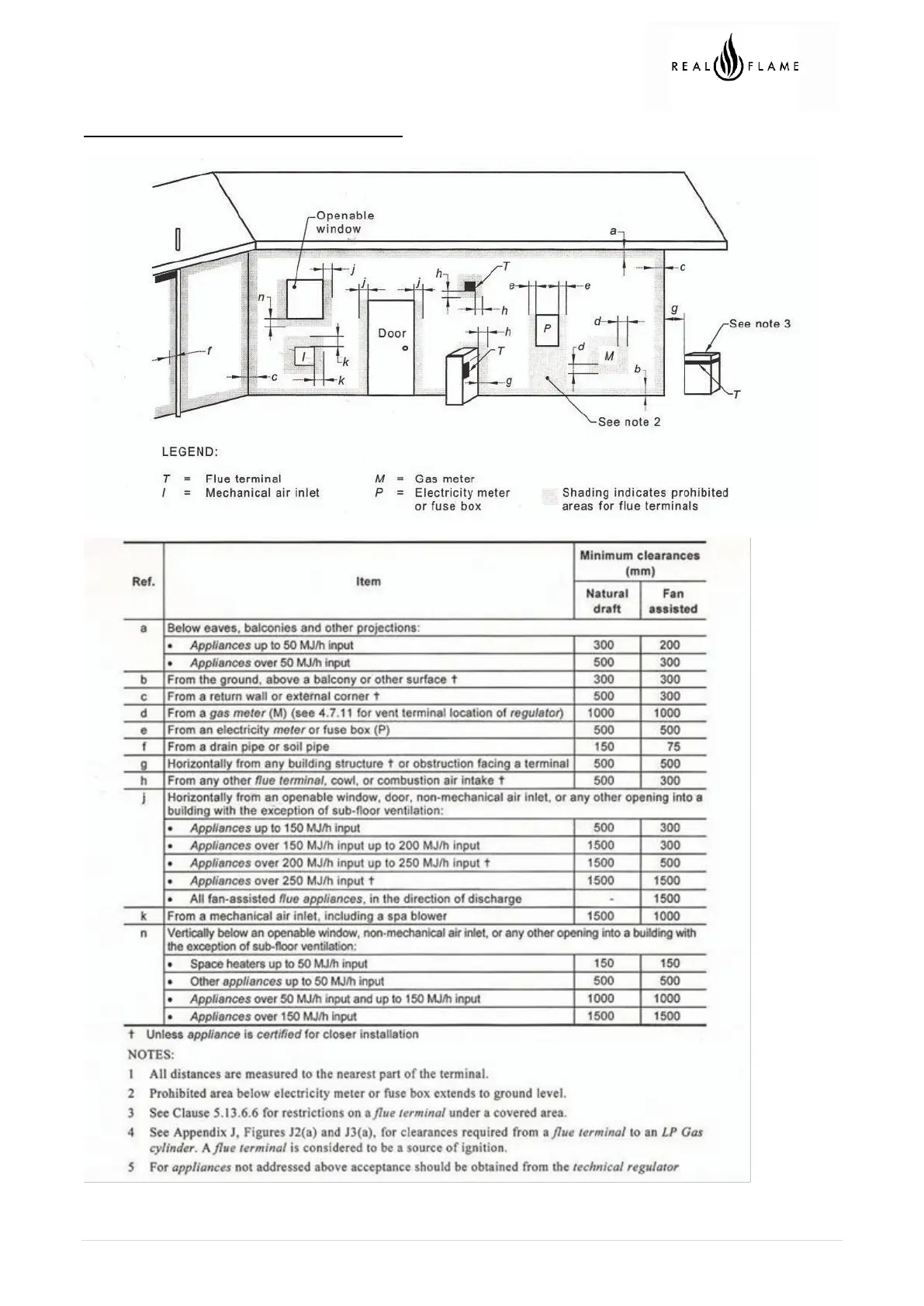 Real Flame 700 - FLUE TERMINAL LOCATION GUIDELINES; Terminal Location Clearances; Clearance Notes