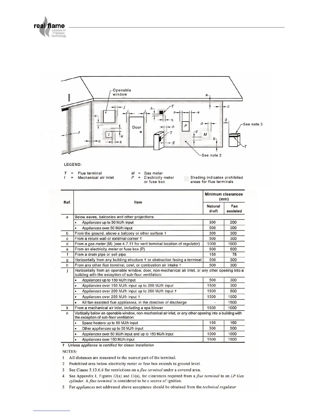Real Flame ACCENT 800 - Flue Termination Clearances; Flue Terminal Legend; Minimum Clearance Table; Clearance Notes and Exceptions