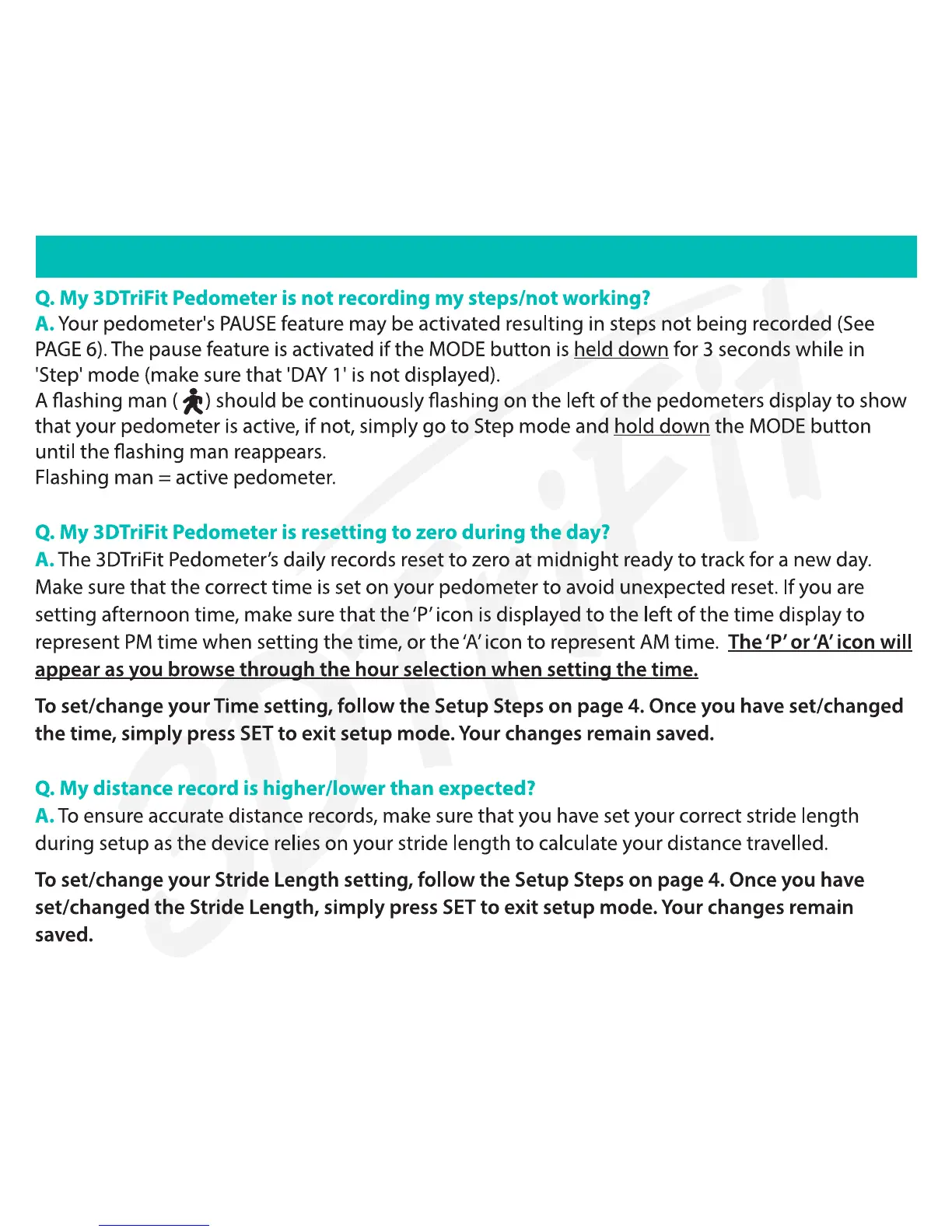 Realalt 3D TriFit - FAQ; Troubleshooting: Pedometer Not Recording Steps; Troubleshooting: Unexpected Daily Reset; Troubleshooting: Inaccurate Distance Records