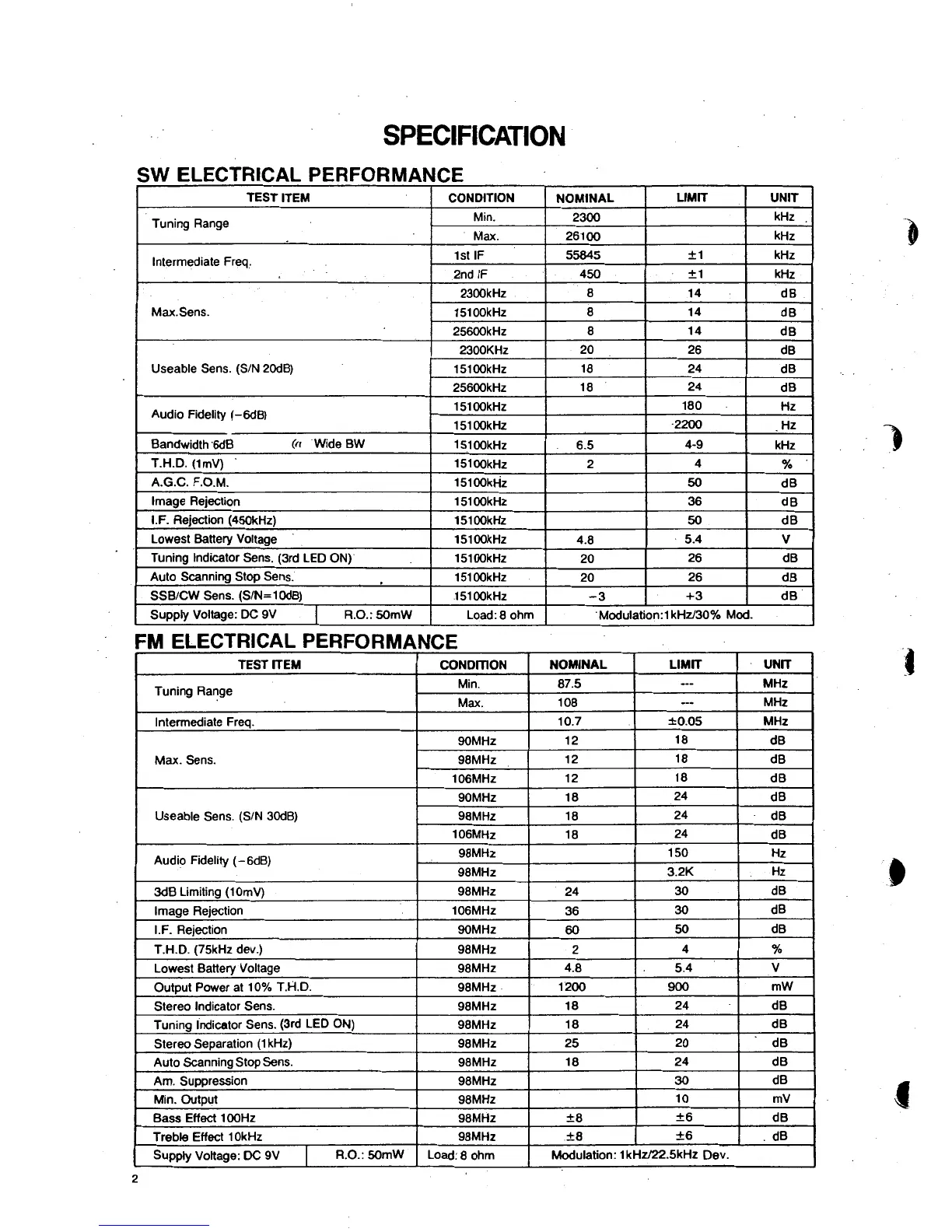 Realistic DX-440 - Specifications Overview; SW Electrical Performance; FM Electrical Performance