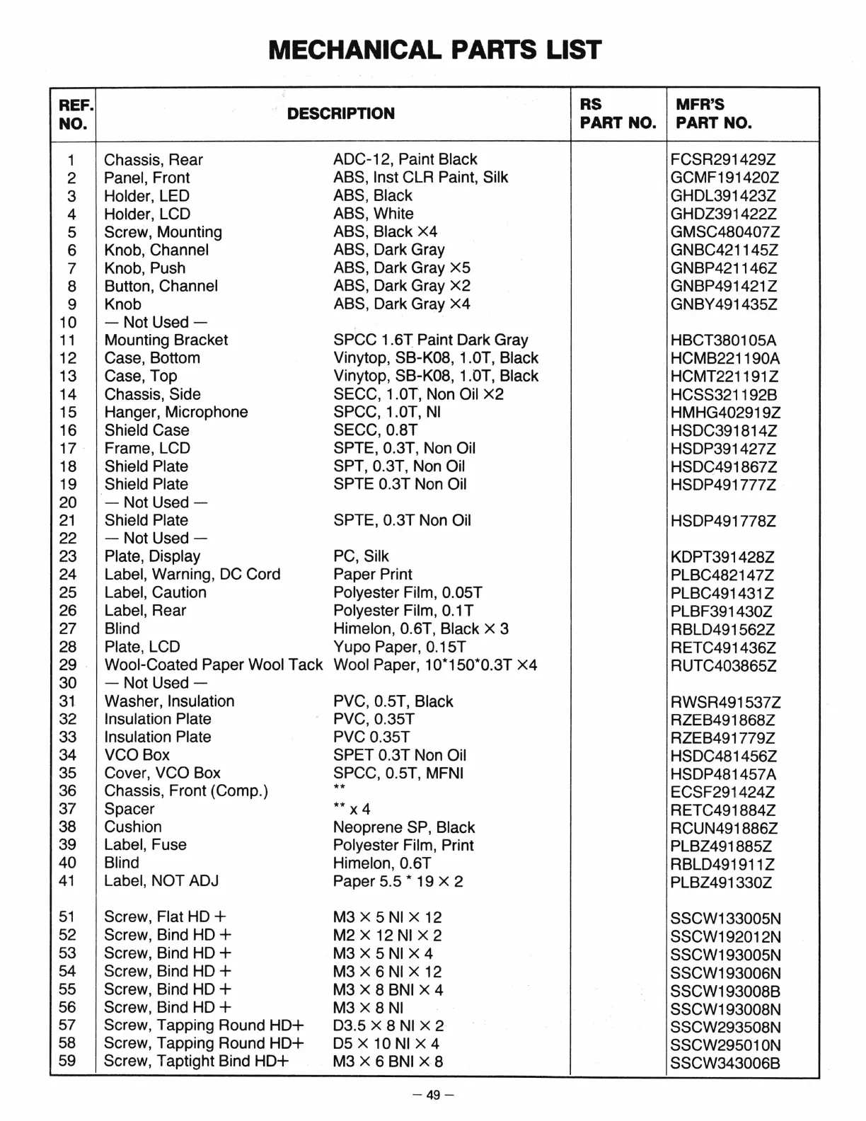 MECHANICAL PARTS LIST