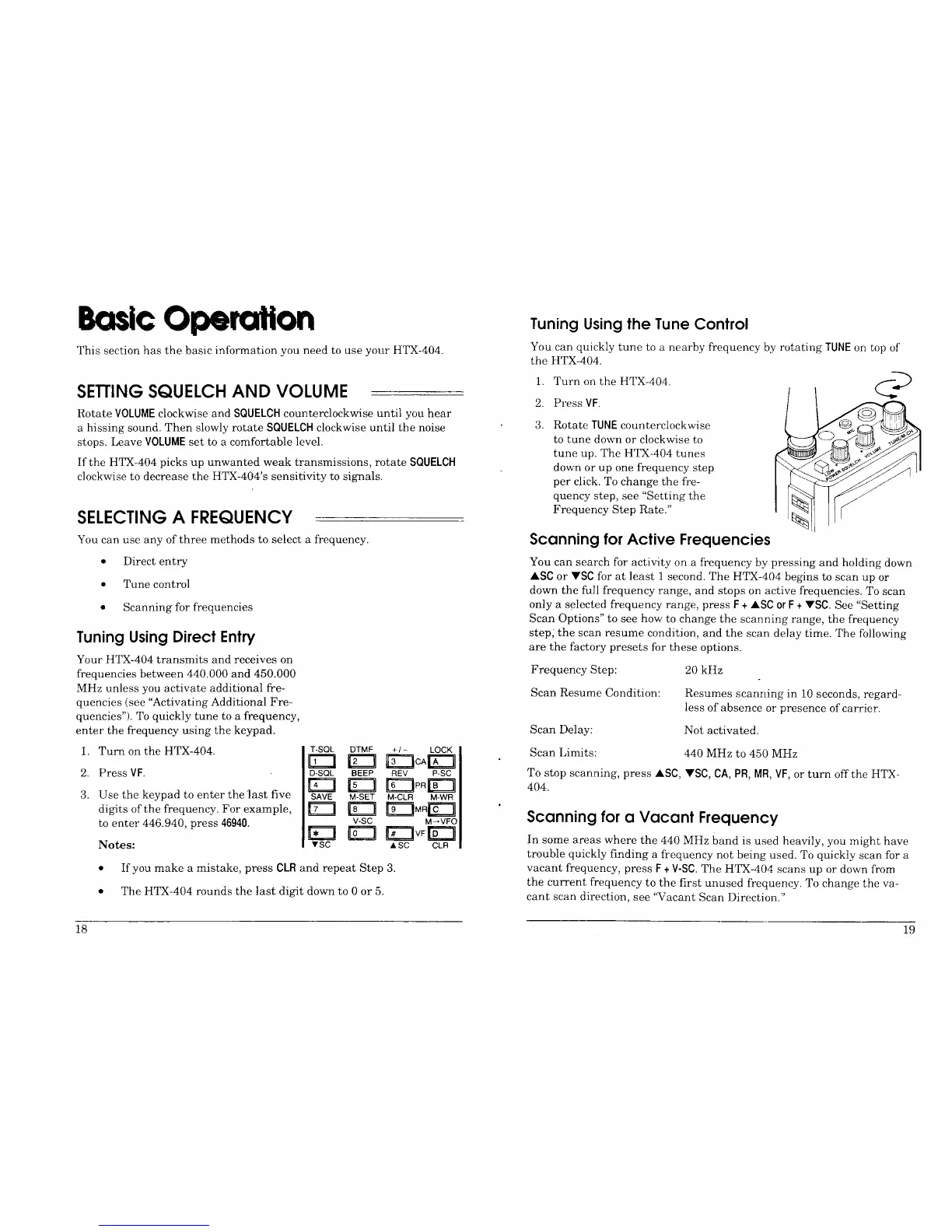 Realistic HTX-404 - Basic Operation; SETTING SQUELCH AND VOLUME; SELECTING A FREQUENCY; Tuning Using Direct Entry