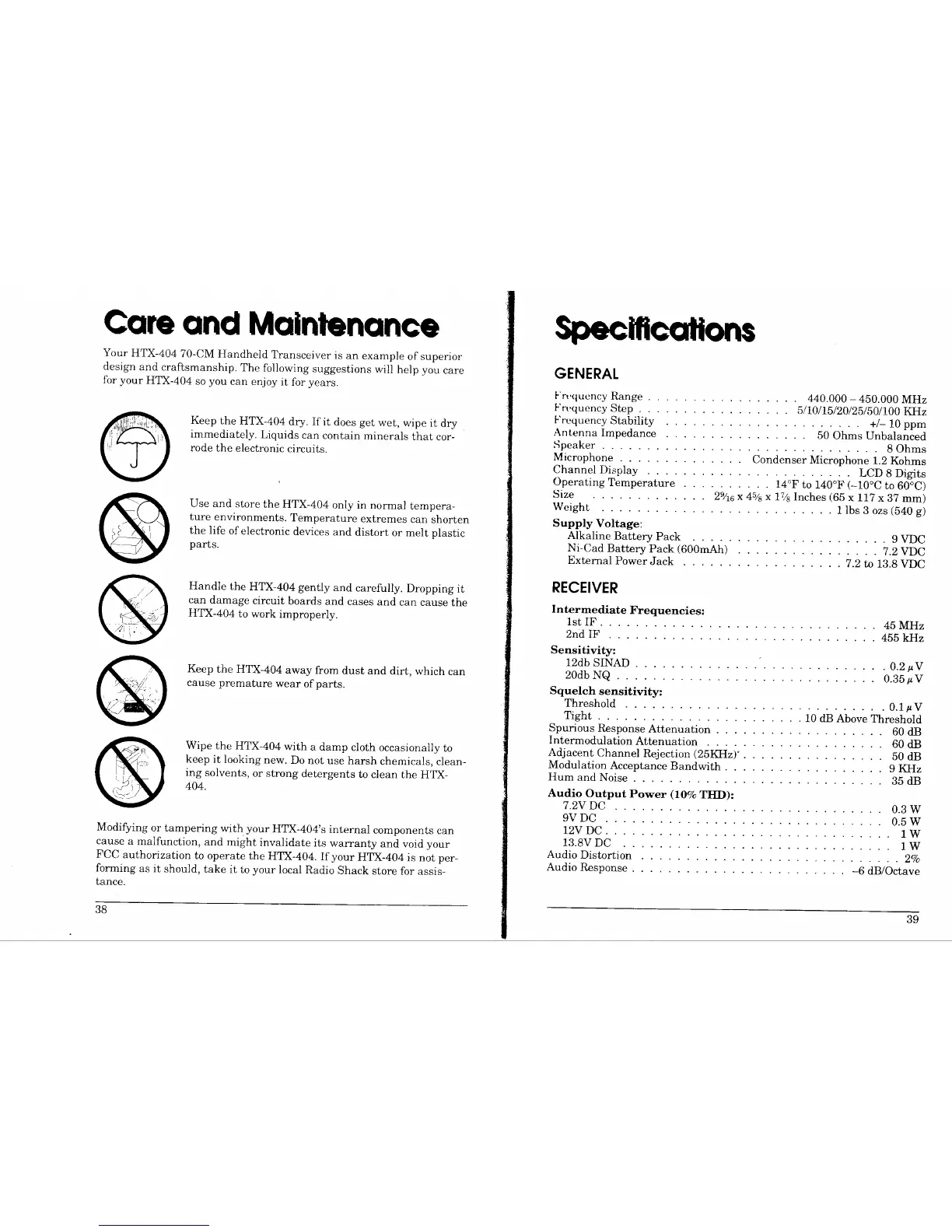 Realistic HTX-404 - Care and Maintenance; Specifications; GENERAL; RECEIVER