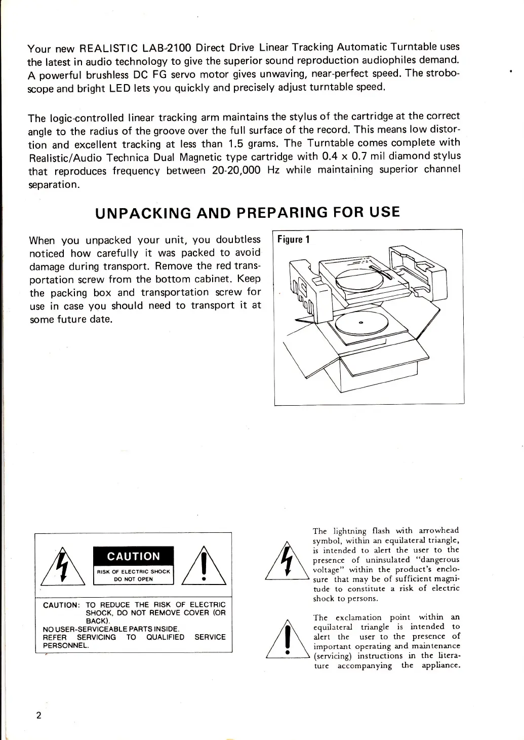 Realistic LAB-2100 - UNPACKING AND PREPARING FOR USE; General Safety Warnings