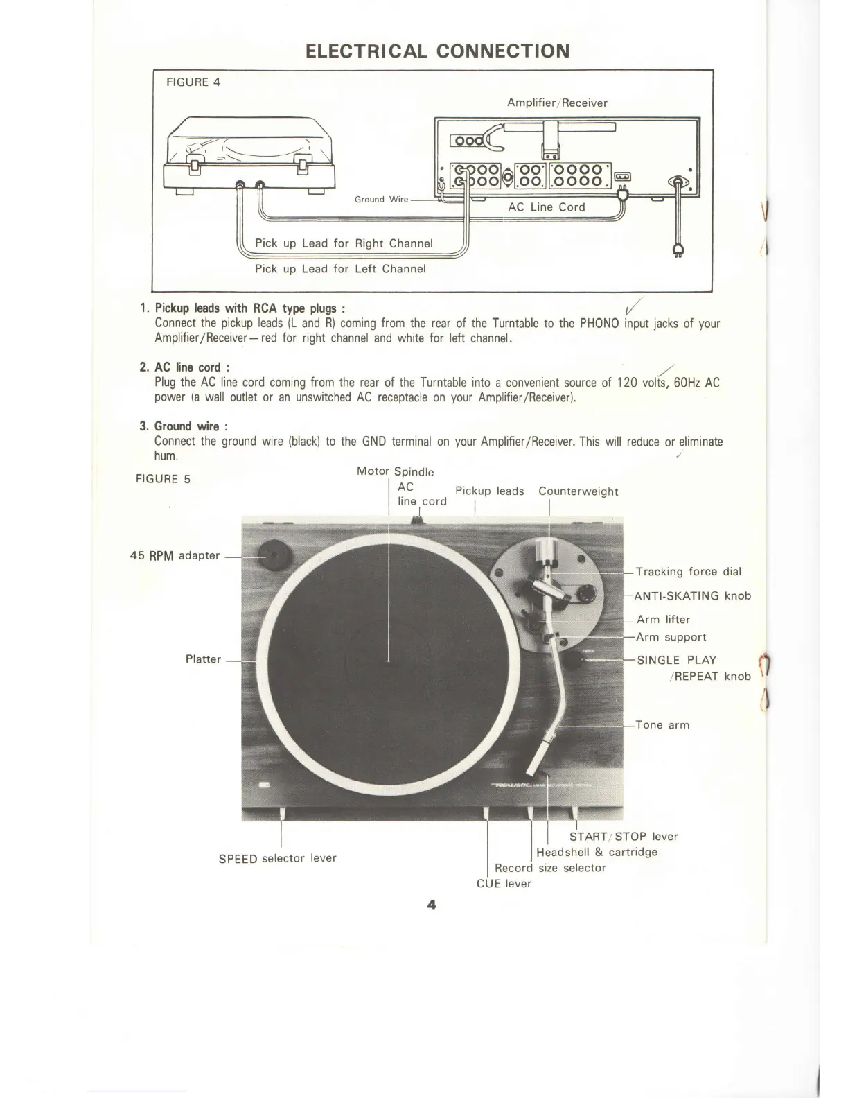 Realistic LAB-500 - Electrical Connection; Connecting Pickup Leads; Connecting the AC Line Cord; Connecting the Ground Wire