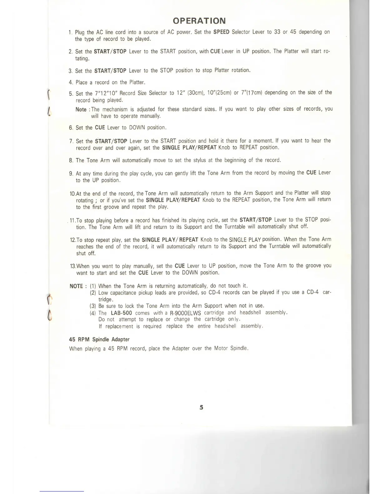 Realistic LAB-500 - Operation; Starting, Stopping, and Manual Playback; Repeat Playback and Automatic Functions