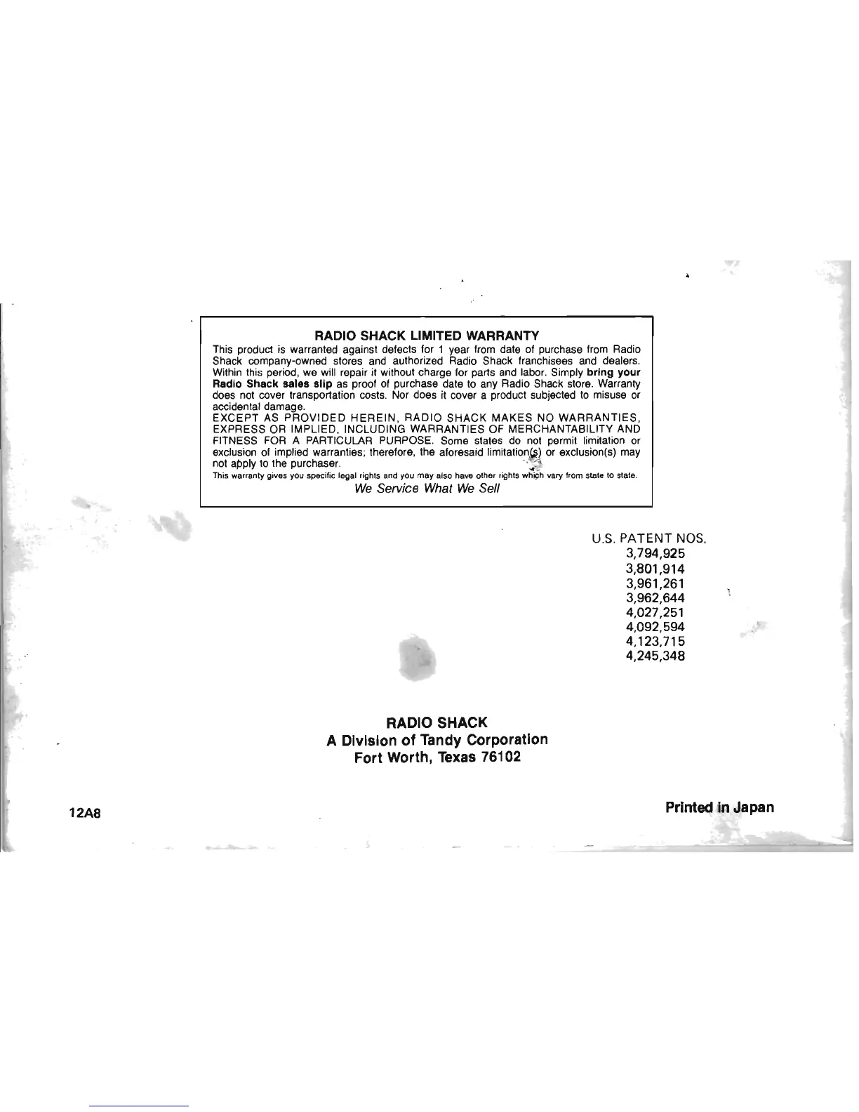 any Radio Shack store. Warranty