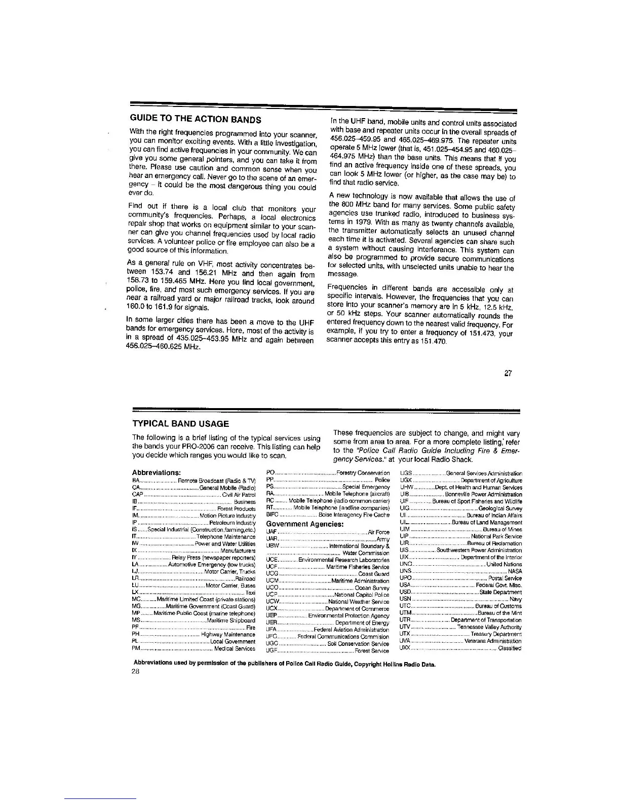 Realistic PRO-2006 - Guide to the Action Bands; Typical Band Usage
