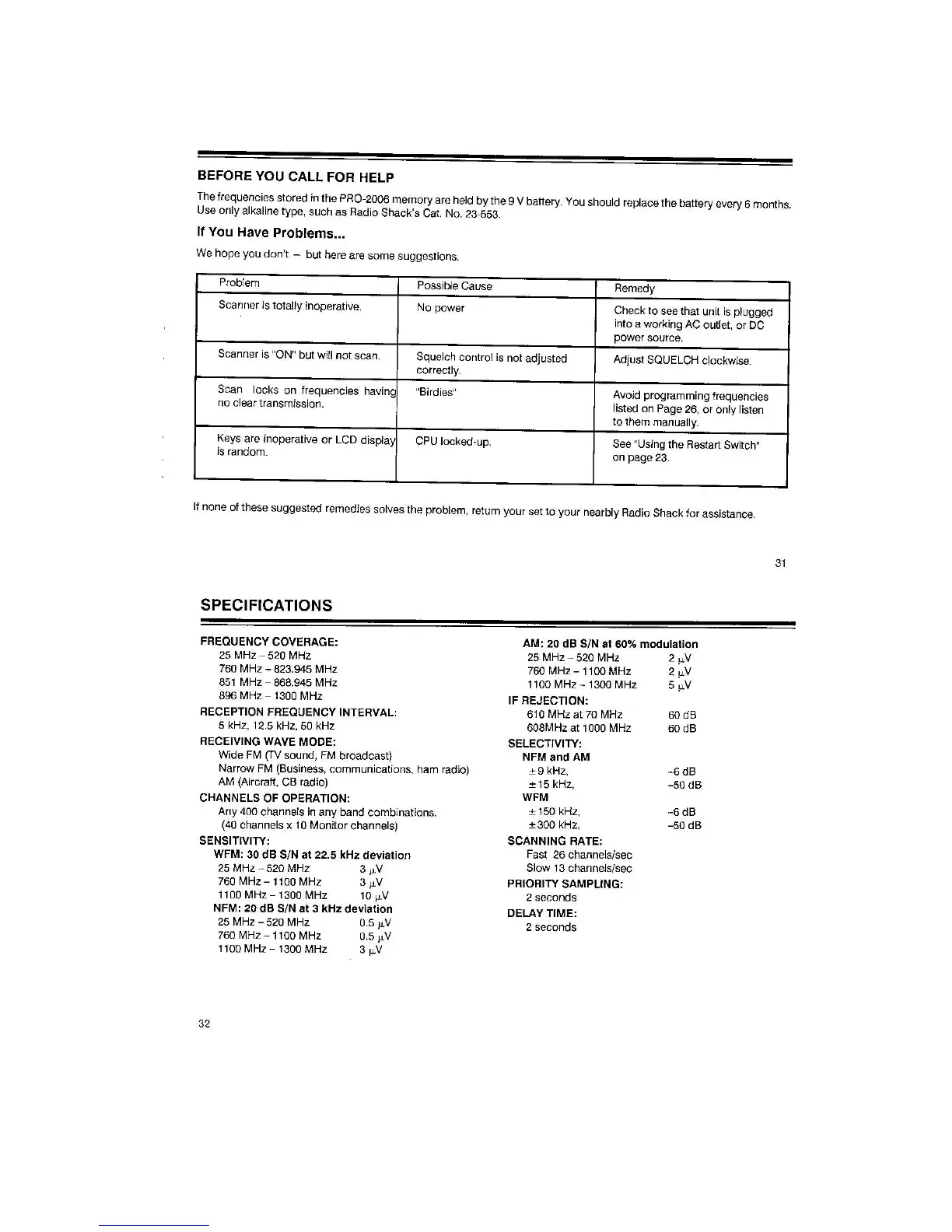 Realistic PRO-2006 - Troubleshooting and Specifications; Troubleshooting Common Problems; Scanner Specifications