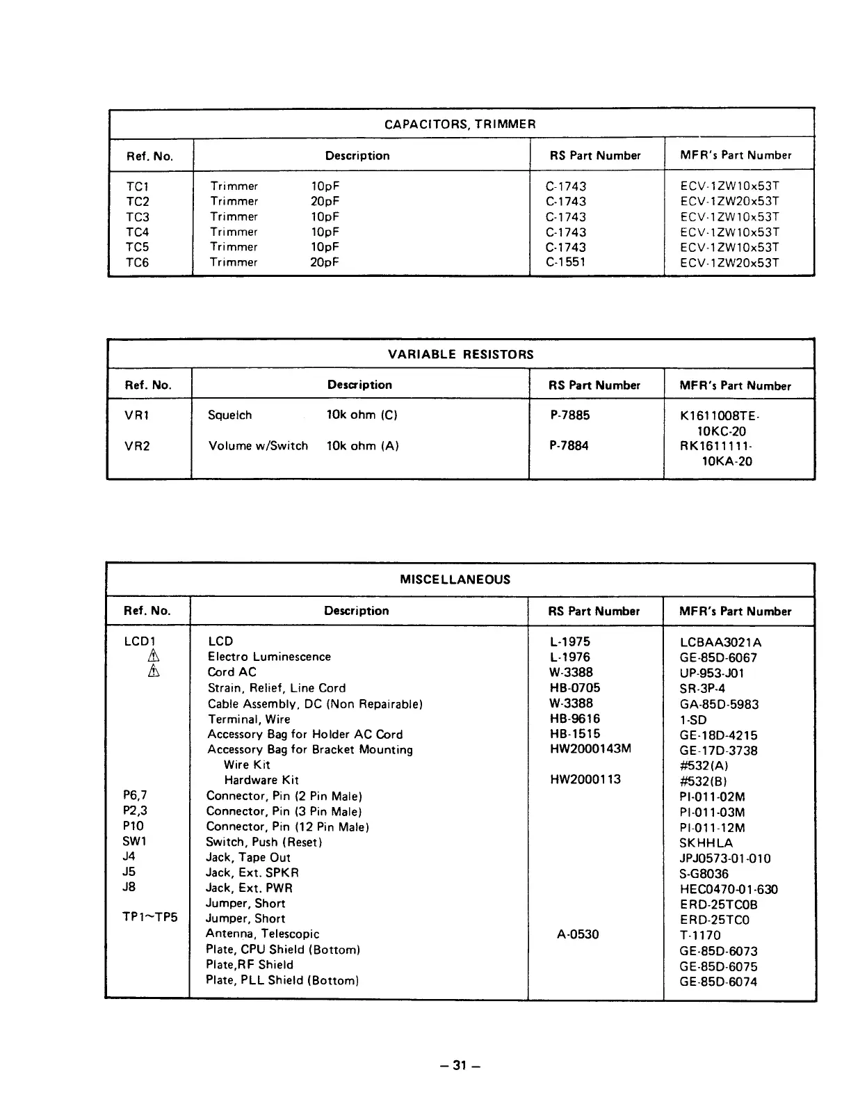Realistic PRO-2021 - Capacitors, Trimmer; Variable Resistors; Miscellaneous Parts