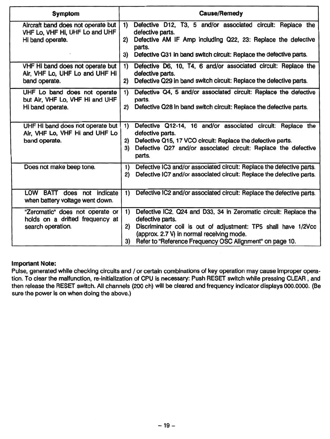 Air, VHF Lo, VHF Hl and UHF Lo defectlve parts.