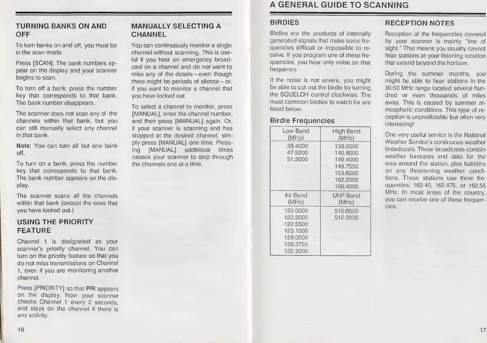 Realistic PRO-2024 - Turning Banks On and Off; Using the Priority Feature; Manually Selecting a Channel; General Scanning Guide